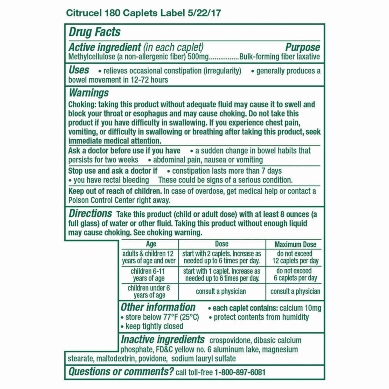 Details: Citrucel caplets with Methylcellulose Fiber are a clinically proven fiber therapy that gently* helps to relieve occasional constipation. In an easy-to-swallow caplet form, our classic go-to formula gently helps relieve irregularity.* Now you can get the additional fiber you need to help balance your diet without unwanted gas.** The most important thing about fiber is that it helps regulate your system and relieves constipation. That’s why Citrucel with Methylcellulose Fiber is recommended by physicians. When it comes to your health, fiber helps with your stool consistency. Citrucel contains 100% soluble fiber, which means it will give your stool a softer, bulkier consistency that's easier to pass. And you’ll get all the benefits of fiber, but without excess gas!** Citrucel with Methylcellulose Fiber caplets can take anywhere between 12 and 72 hours to take effect, so make sure to use the product at the first sign of constipation or irregularity. Try Citrucel caplets today for the effective fiber supplement you’ve been looking for. *When used as directed. **Based on laboratory testing. Individual results may vary.