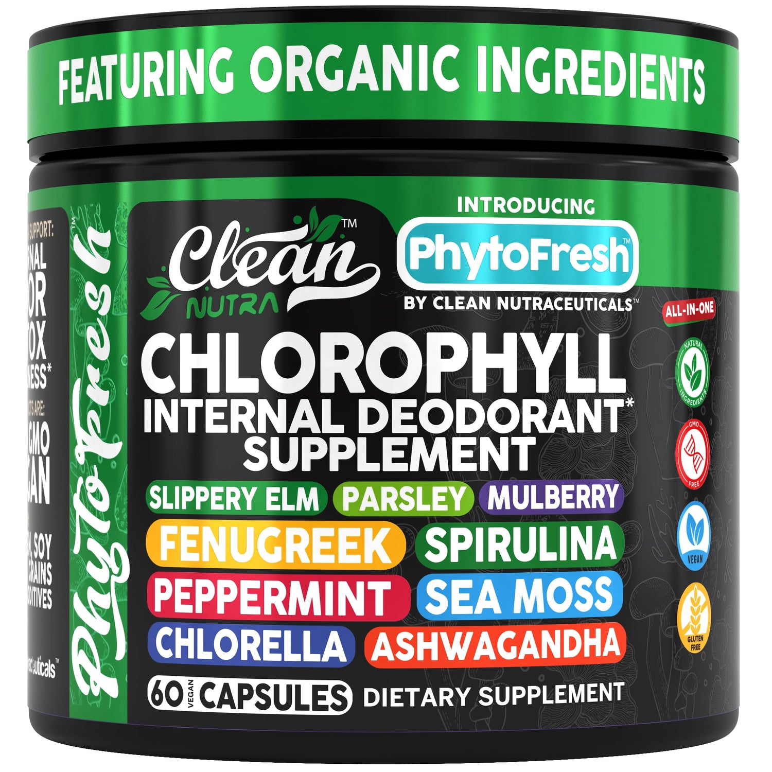 Clean Nutra Chlorophyll Capsules Supplement Internal Deodorant Peppermint, Sea Moss, Parsley, Chlorella, Spirulina, Slippery Elm, Ashwagandha, PhytoFresh Greens Detox Pills