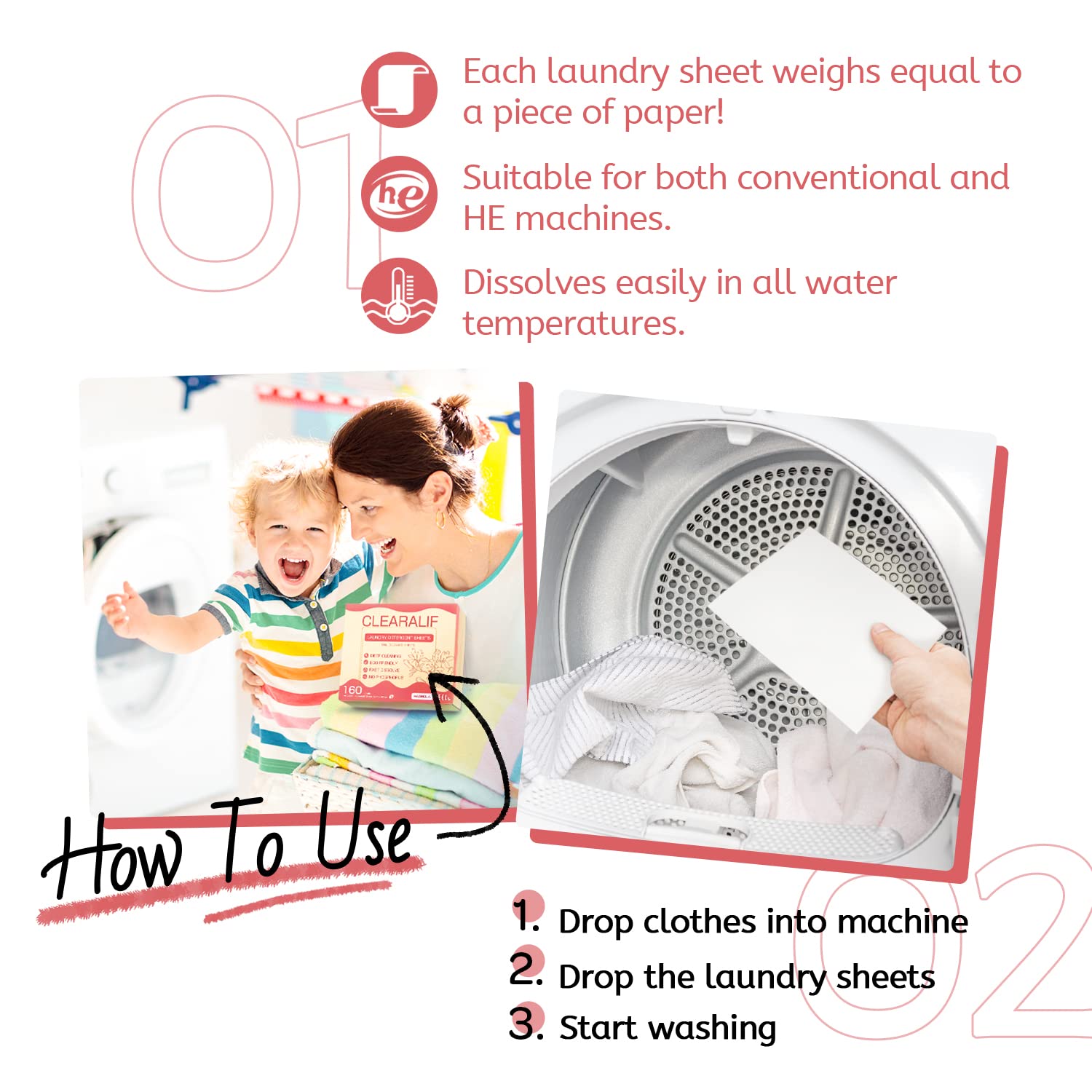 - Easy to Use - Every piece of sheet has been pre-cut and pre-measured. Measuring cups are no longer needed. Laundry sheets dissolve quickly in both hot and cold water and can be used in conventional and HE washing machines.