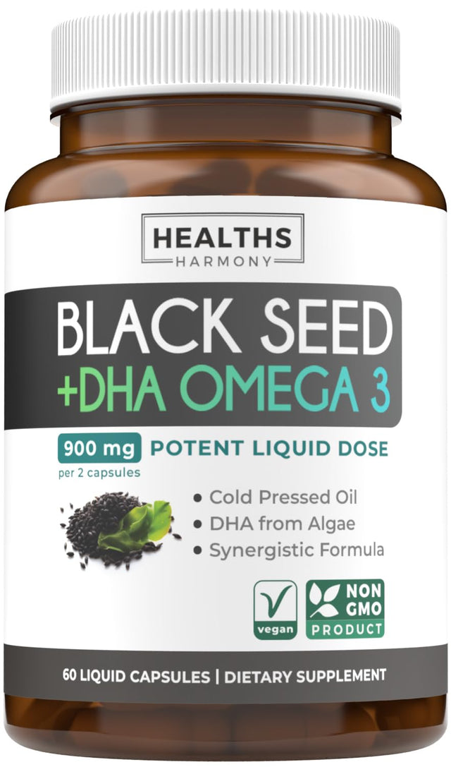 Cold-Pressed Black Seed Oil Capsules - Vegan Non-GMO Nigella Sativa Black Seed Oil Supplement with Omega 3 DHA for Full Body Wellness & Brain Support - Vegan Omega 3 & Thymoquinone-Rich (1 Month)