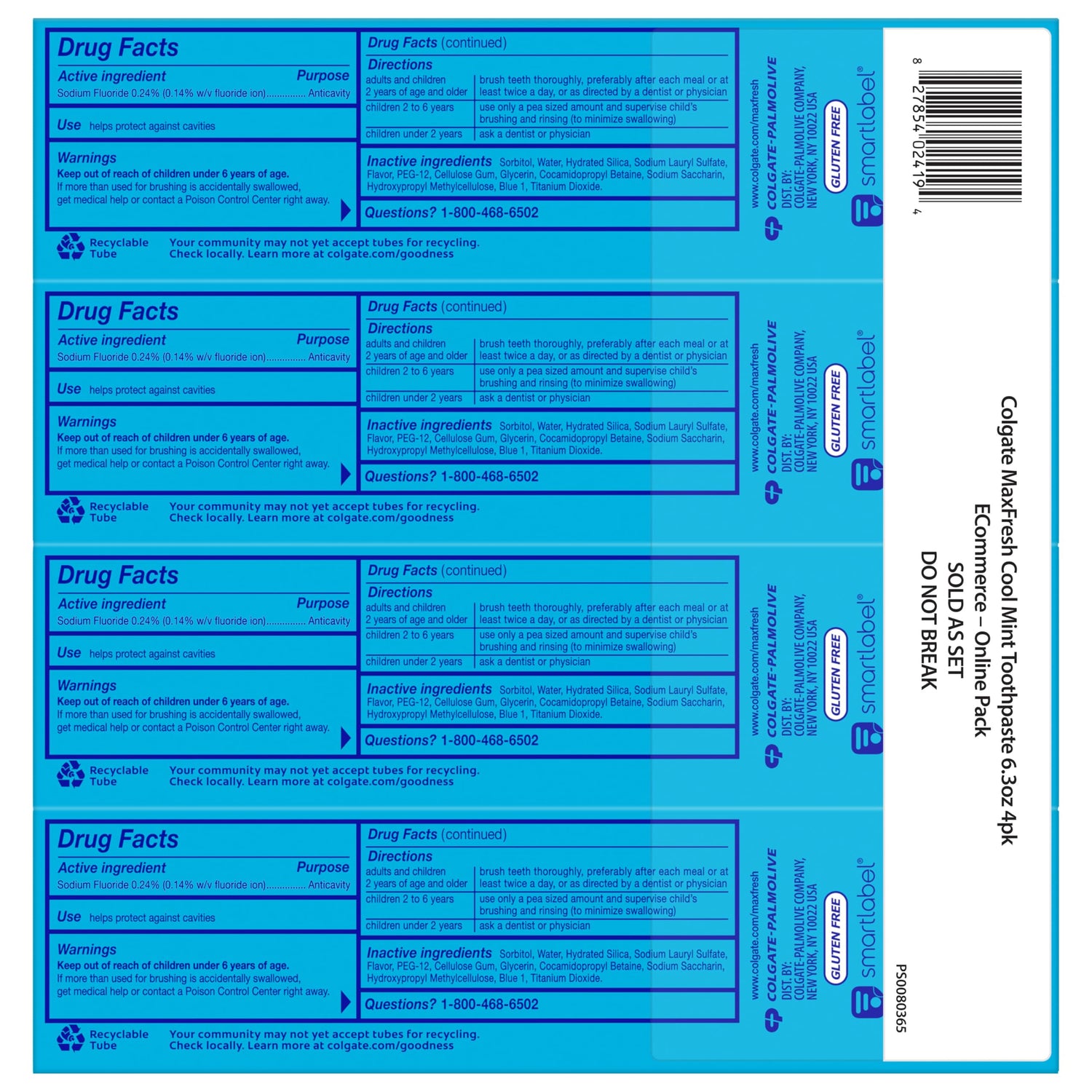 - Includes four (4) 6.3 oz tubes of Colgate MaxFresh Cool Mint Toothpaste