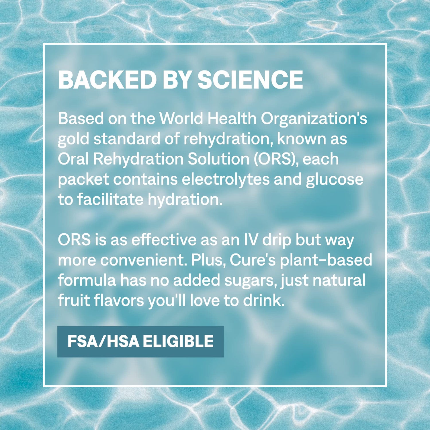 - RAPID ABSORPTION: Based on the World Health Organization’s gold standard of rehydration, known as Oral Rehydration Solution, each packet of Cure contains electrolytes and glucose to facilitate rapid hydration directly into your bloodstream. ORS is as effective as an IV drip, but way more convenient.