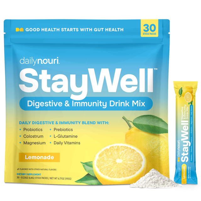 Daily Nouri StayWell Digestive & Immunity Drink Mix | Probiotics, Prebiotics, Colostrum, L-Glutamine, Magnesium, Manganese, Zinc, Vitamins for Gut Health, Digestion & Immune Support | 30 Stick Packs