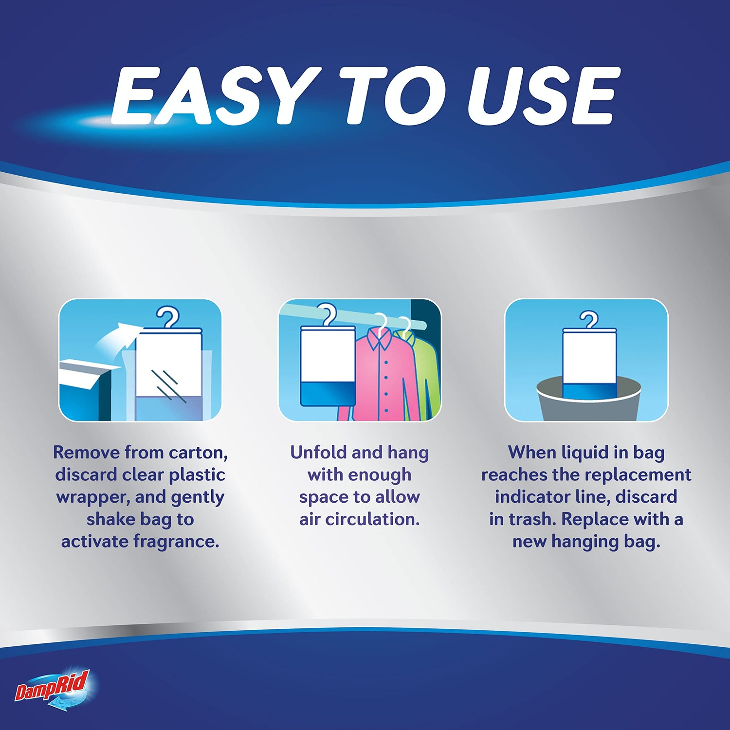 - LONG-LASTING FRESHNESS: DampRid hanging bag moisture absorbers can last up to 60 days depending on temperature and humidity.