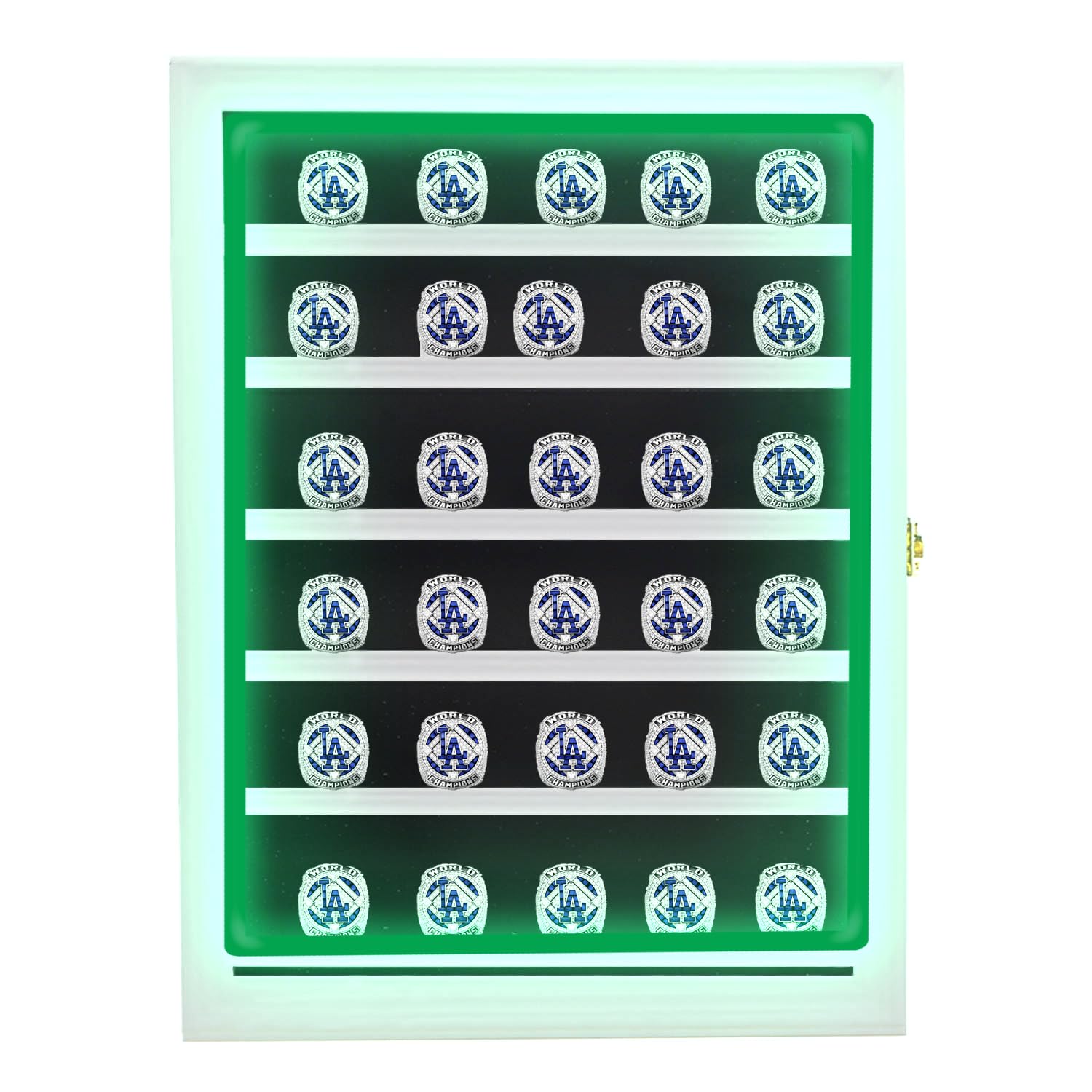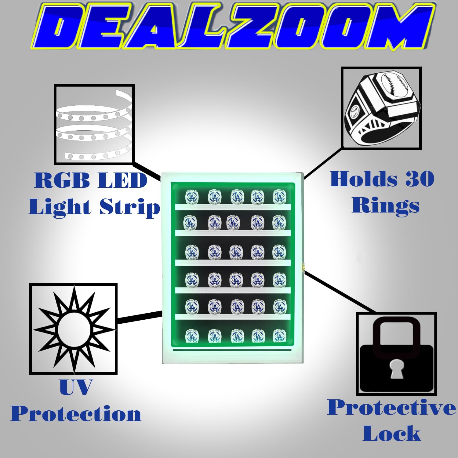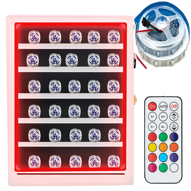 DEALZOOM Championship Ring Display Case RGB LED - 30 Ring Large Baseball Ring Display Cases – Wall Display Case Ring Storage, Baseball Ring Holder Display, Holds Basketball Football Rings (White)
