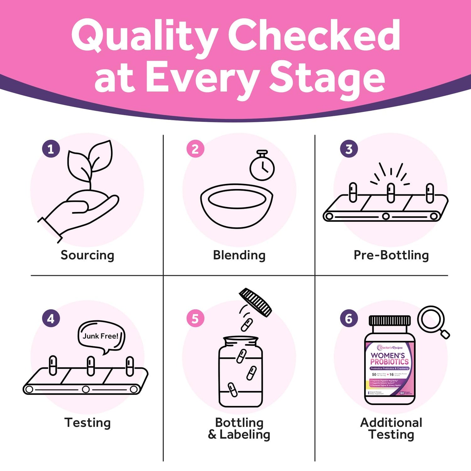 - Proudly Made In The USA: Our advanced strength formula is loaded with the highest grade & naturally sourced ingredients in FDA inspected and GMP certified facility in the USA. Doctor's Recipes Women Probiotics is 100% pure, natural, vegan friendly & NON-GMO with no soy, gluten and dairy