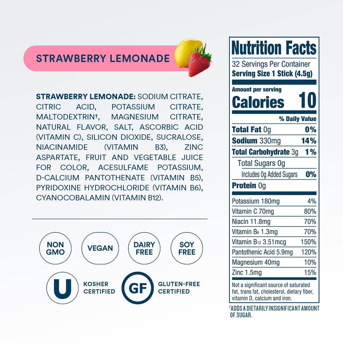 - HEALTH-CONSCIOUS FORMULA: Non-GMO, Gluten-Free, Vegan, Soy-Free, Dairy-Free and Kosher. Our sugar free hydration packets include essential nutrients like potassium, magnesium, zinc, and vitamin C for added immune support, plus vitamins B3, B5, B6, and B12 for healthy energy and metabolism. Natural colors derived from sources including fruit and vegetable juices, turmeric, spirulina extract, and beta carotene. No FD&C colors ever (no Red 40).