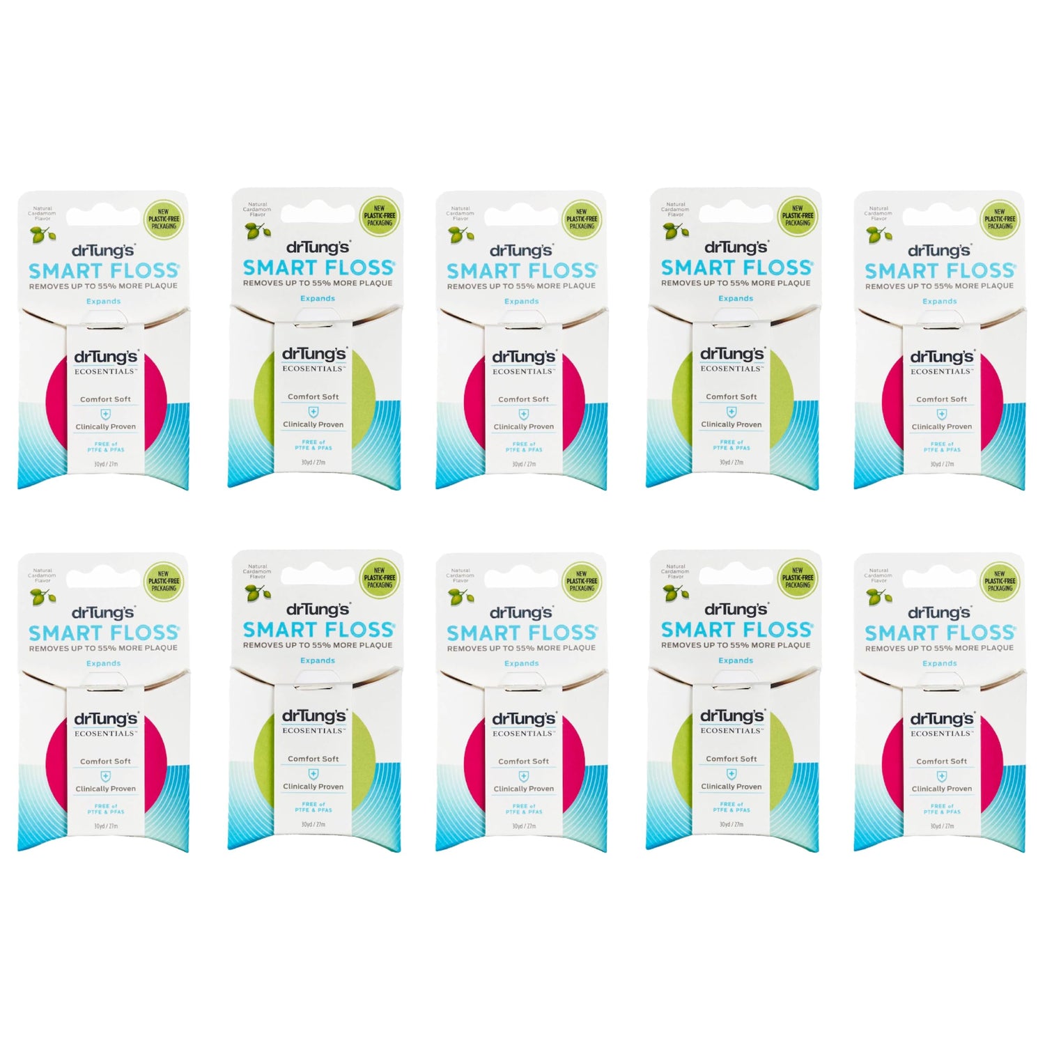 DrTung's Smart Floss - Natural Floss, PTFE & PFAS Free Floss, Gentle on Gums, Expands & Stretches, BPA Free - Cardamom Flavor, Colors Vary (10 Pack)