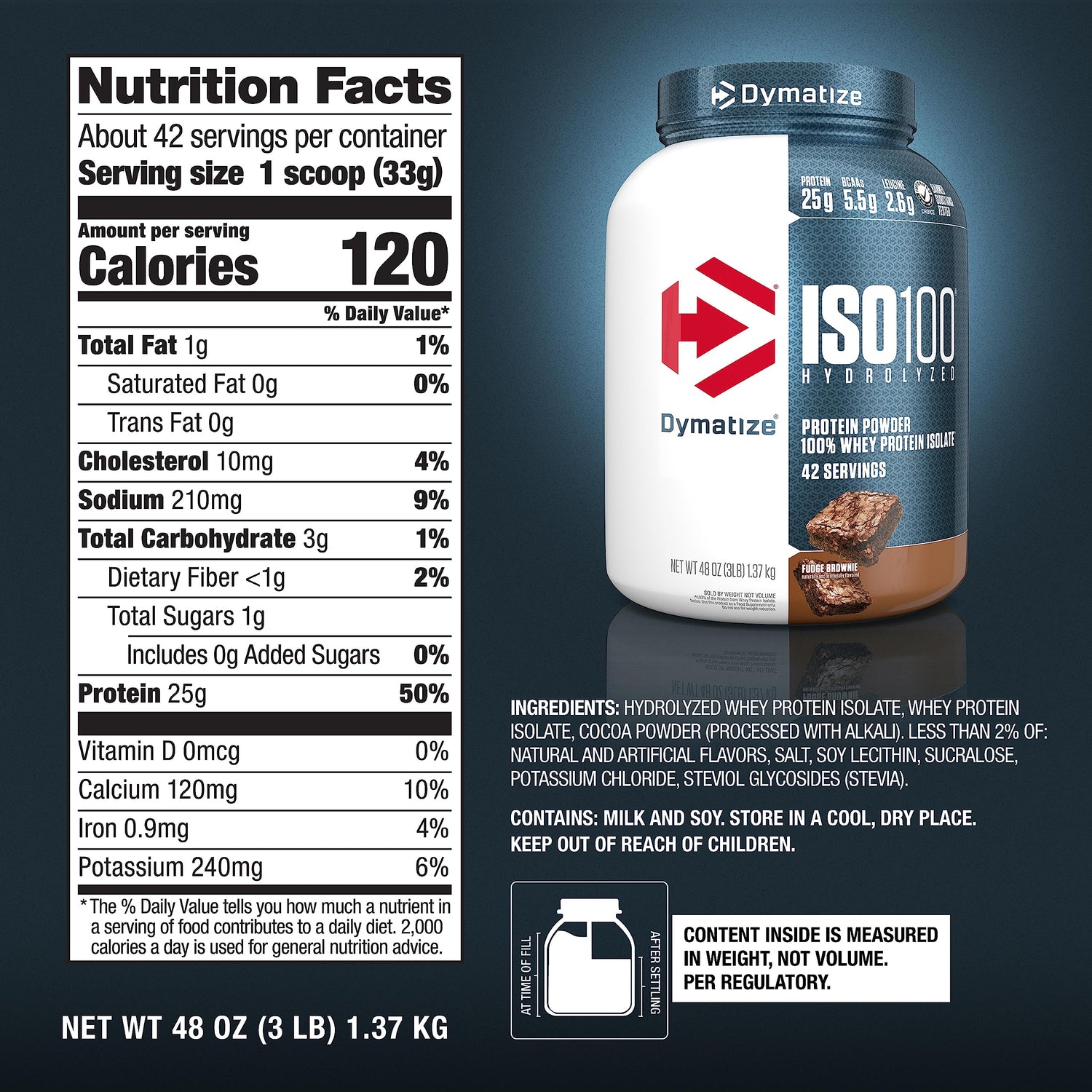 Dymatize ISO100 Whey Protein Powder Isolate, Fudge Brownie, 25g of Protein, 3 Pound, 5.5g BCAAs, Less Than 120 Cal., Gluten Free, 1g Fat, 1g Sugar, 2g Carb (42 Servings)
