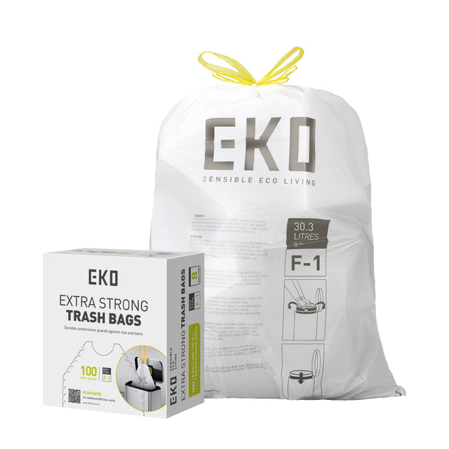 EKO 8 Gallon Trash Bags Drawstring 1.2 Mil - 100 Count White Medium Garbage Bags Unscented, 30 Liter Plastic Kitchen Trash Bags with Easy-Dispense, Code F-1
