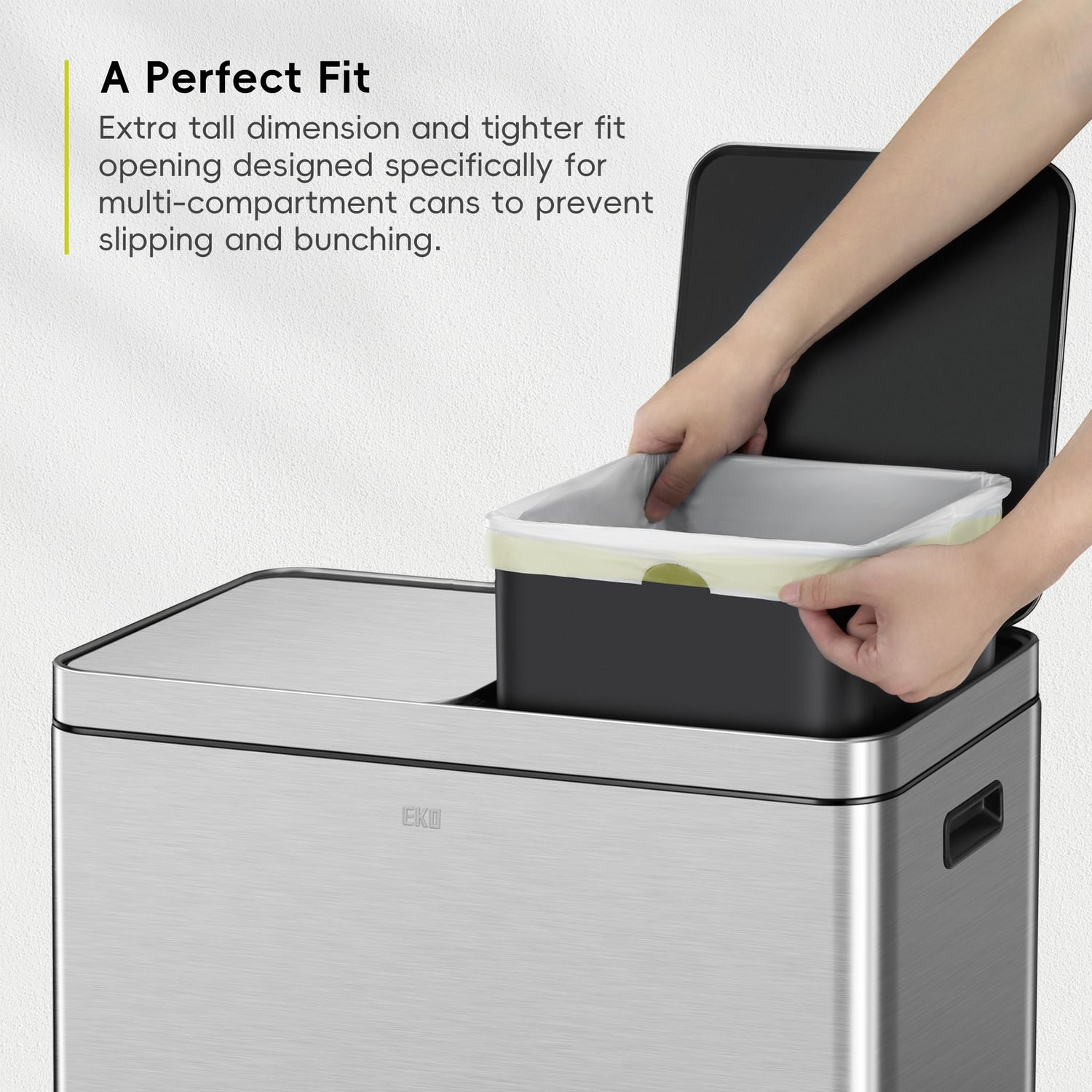 - VERSATILE FIT: With dimensions of 19.3 x 27.6 inches, EKO trash bags are designed to fit EKO trash cans, especially tall kitchen trash cans, dual compartment recyclers and wastebaskets.