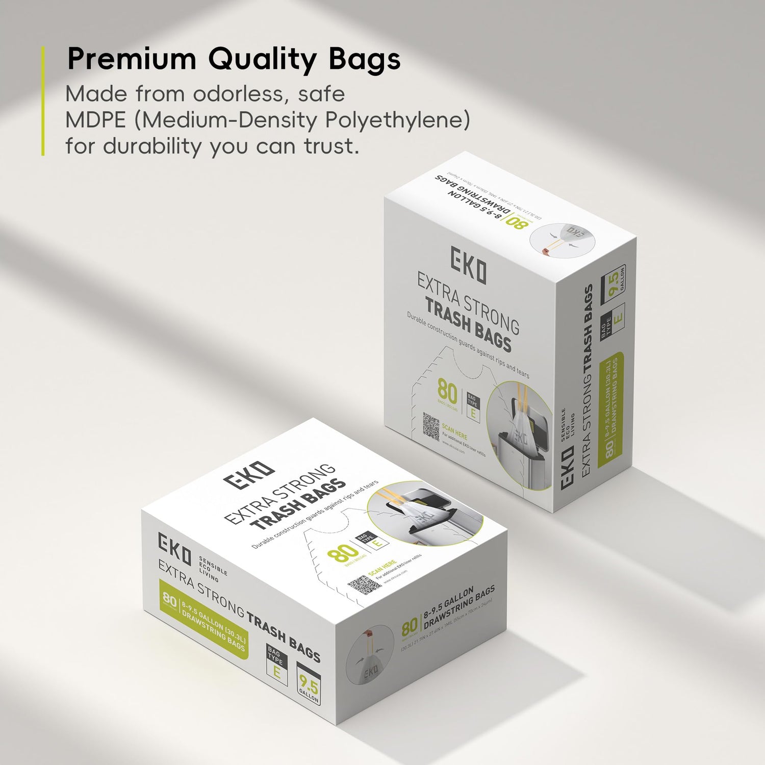 EKO Easy-Dispense Roll 80 Count Extra-Strong Drawstring Tall Kitchen Trash Bag, 8-9.5 Gallon Trash Bag (30.3L-36L) 1 Pack White, Code E