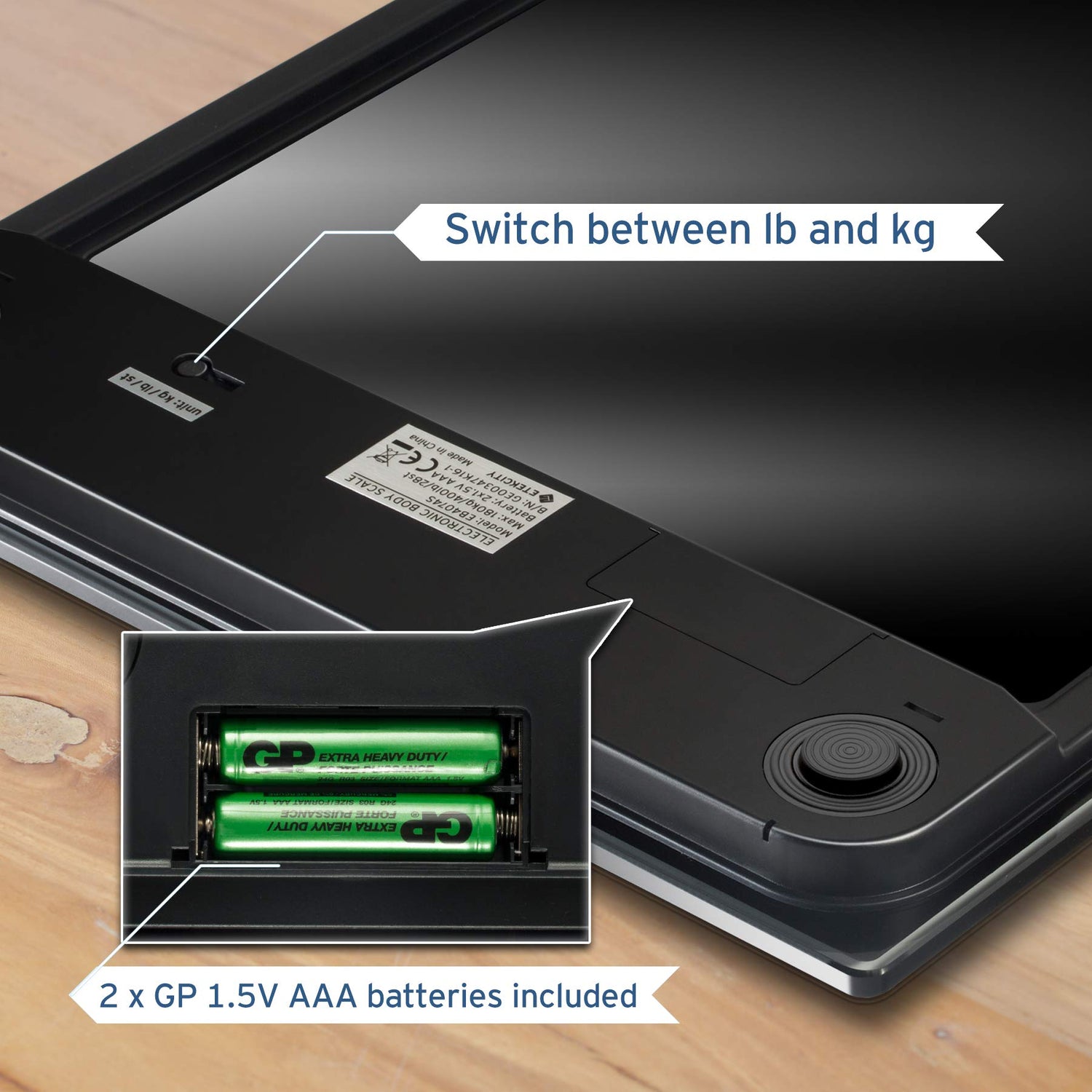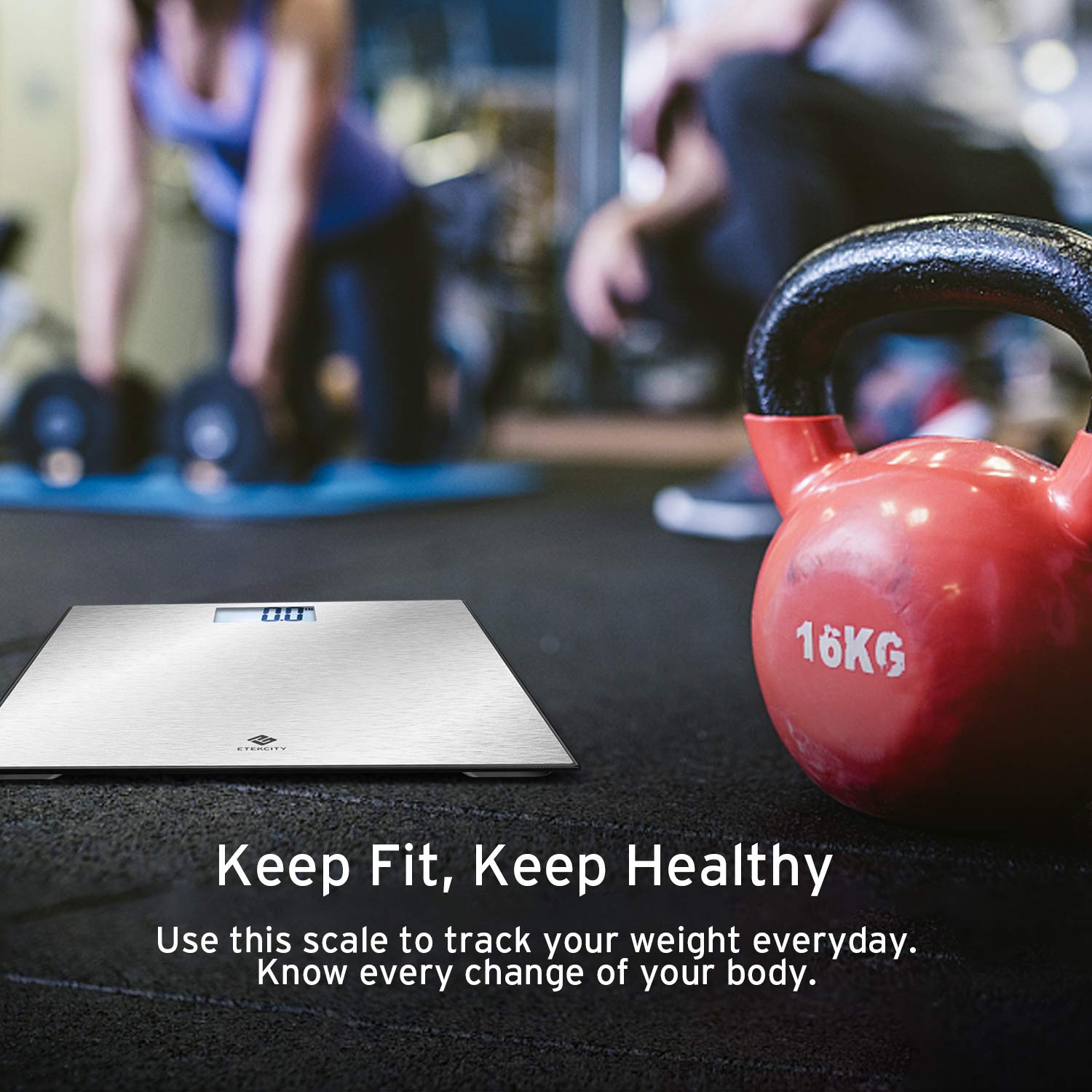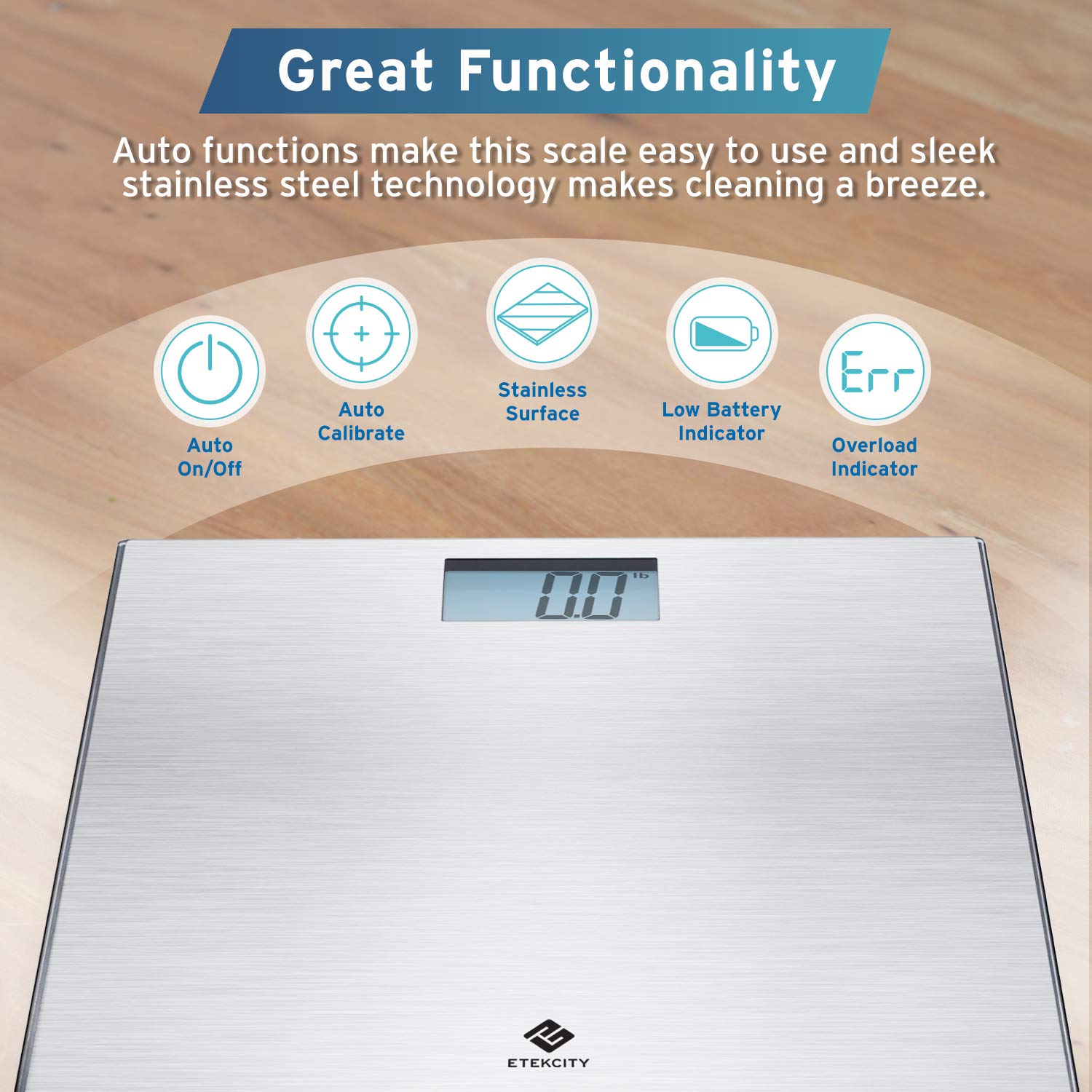 Details: Be your own health and fitness advocateWhether you’re after weight-loss, muscle gains, or maintenance, the digital scale delivers lightning-quick measurements with a 400 lb / 180 kg capacity and 0.2 lb accuracy resolution.Fortified with features to help you thriveThis digital scale has an auto-off feature to save energy, and low battery and overload indications to prolong its lifespan. And the rust-resilient stainless steel platform is stylish and easy to clean.Three Layers, Perfectly IntegratedThree integrated layers of ABS material, temerped glass, and stainless steel provide a stable, durable, and stylishly sleek platformSpecificationsMeasurement Range: 11lb-400lb (5kg-180kg)Resolution: 0.2 lb / 100gUnit: lb / kgPlatform: 11.8” x 11.8” x 0.87” / 300 x 300 x 22 mmLCD Display: 2.9” x 1.5” / 74 x 38 mmPower Source: 2 x GP AAA batteries (included)Package Includes1 x Etekcity Digital Bathroom Scale1 x QSG 2 x AAA Batteries Note: 1. Clear the scale: step on the scale until the display lights up, then step off until the scale shows "0.0." Do this each time you are measuring your weight. 2. Try weighing first thing in the morning (after using the restroom) and with minimal clothing to prevent deviation or skewed readings.