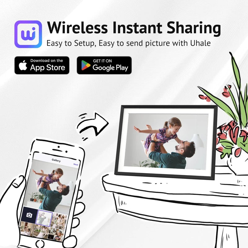 - ๐๐ก๐๐ซ๐ ๐๐ซ๐ข๐ฏ๐๐ญ๐๐ฅ๐ฒ, ๐๐จ๐ฏ๐ ๐๐ง๐๐ฅ๐๐ฌ๐ฌ๐ฅ๐ฒ: Connect Euphro digital picture frame to a WiFi network and share photos and videos via the free โUhaleโ app, available on both Android and iOS. Share the special life moments instantly and privately, creating a seamless connection with your family and friends.