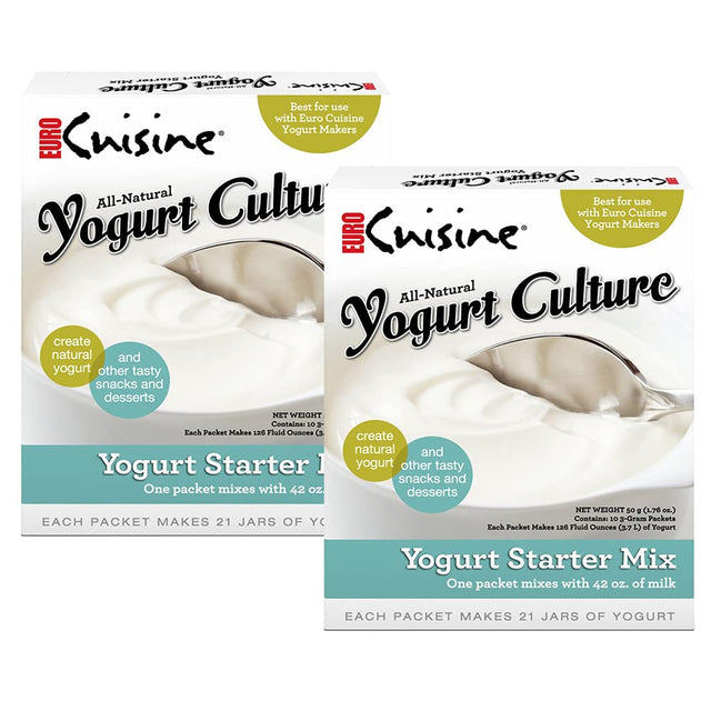 Details: Indulge in the art of making your own creamy, delicious yogurt at home with Euro Cuisine All Natural Yogurt Culture Yogurt Starter. This product is not just a yogurt culture starter; it's a gateway to healthier, tastier, and more personalized yogurt creations. Whether you're a fan of protein-rich whole milk yogurt, or exploring the subtleties of French yogurt, our starter is your ideal companion. Crafted in France, this Kosher-certified starter brings the essence of authentic French yogurt to your kitchen. The unique blend of Lactobacillus bulgaricus, Streptococcus thermophilus, and Lactobacillus acidophilus in our starter ensures that each spoonful of your homemade yogurt is packed with probiotics, aiding in digestive health. Our all-natural, freeze-dried starter is not just about health benefits; it's also about convenience and economy. Each box contains ten 3g pouches, each capable of creating 42 oz. of yogurt. This means you can make large batches of yogurt that can be flavored to your liking – be it yogurt coconut, plain yogurt, or even a unique yogurt powder blend. The process is simple: mix the starter into the milk (be it goat, whole), then pour the mixture in the glass jars and then place the glass jars into your yogurt maker. Within hours, you'll have a batch of perfectly balanced, creamy, and smooth yogurt, depending on the type of milk used. Embrace the joy of homemade yogurt with Euro Cuisine's All Natural Yogurt Culture Yogurt Starter and transform your kitchen into a gourmet yogurt paradise.
