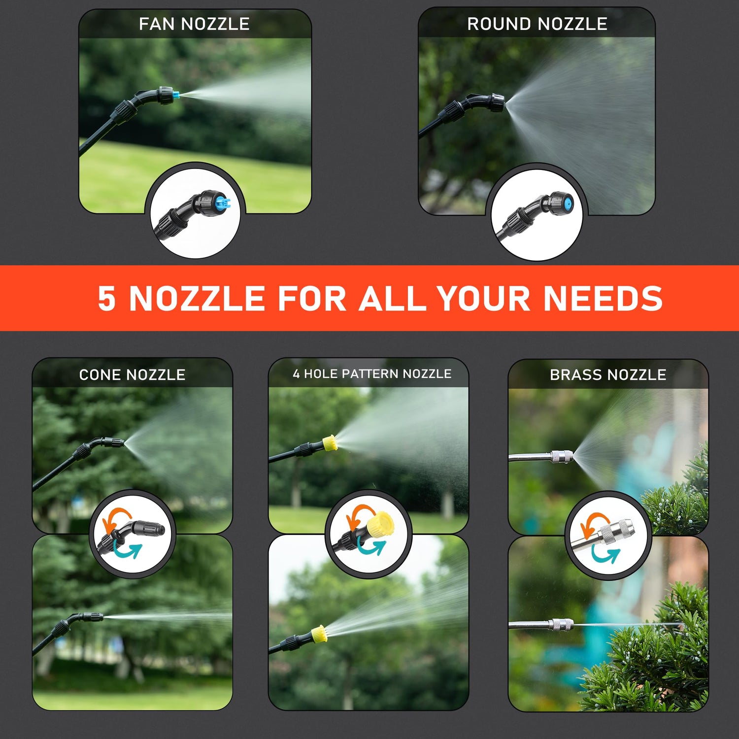 - ๐ ๐๐ข๐๐๐๐ซ๐๐ง๐ญ ๐๐จ๐ณ๐ณ๐ฅ๐ - Get 6 different weed sprayerโs nozzles included - F-type Double Nozzle, Mist Fan Nozzle, Cone Nozzle(straight to mist), 4 Hole Pattern Nozzle(straight to mist), Round Nozzle and a Brass Nozzle (straight to mist)