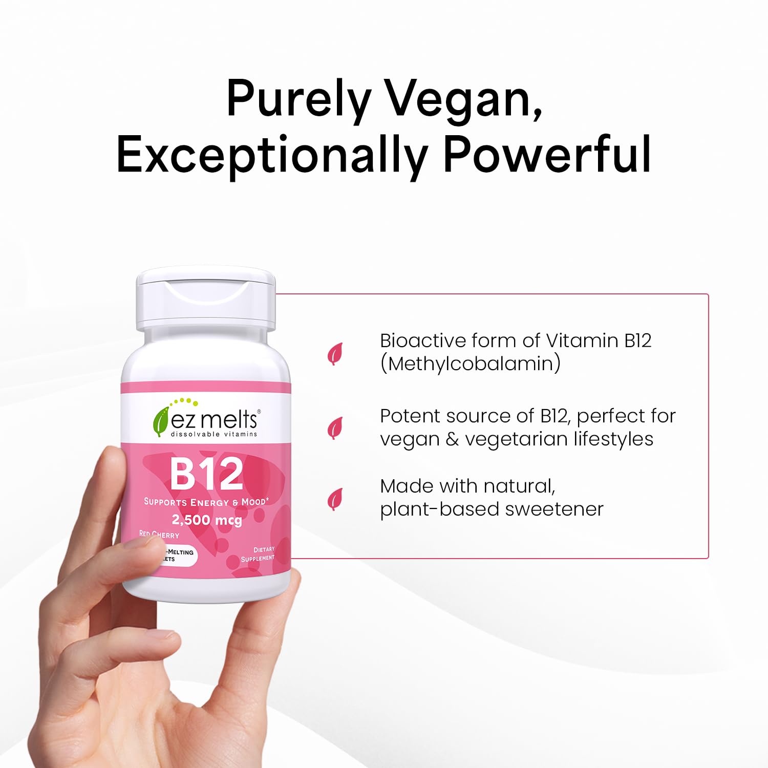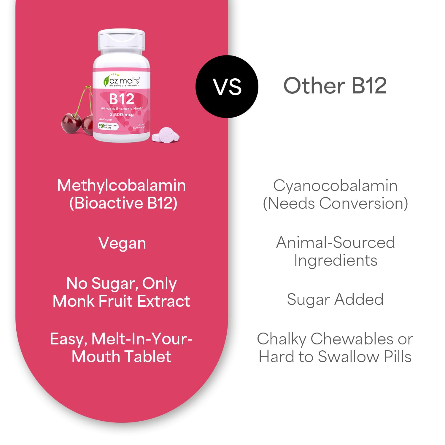 - Delicious Taste Without Compromise –– Sugary supplements seem counterintuitive. That's why our vegan B12 vitamin has zero sugar. The pleasant cherry flavor taste is created using plant-derived ingredients to make these vitamin B12 supplements easy on your tastebuds