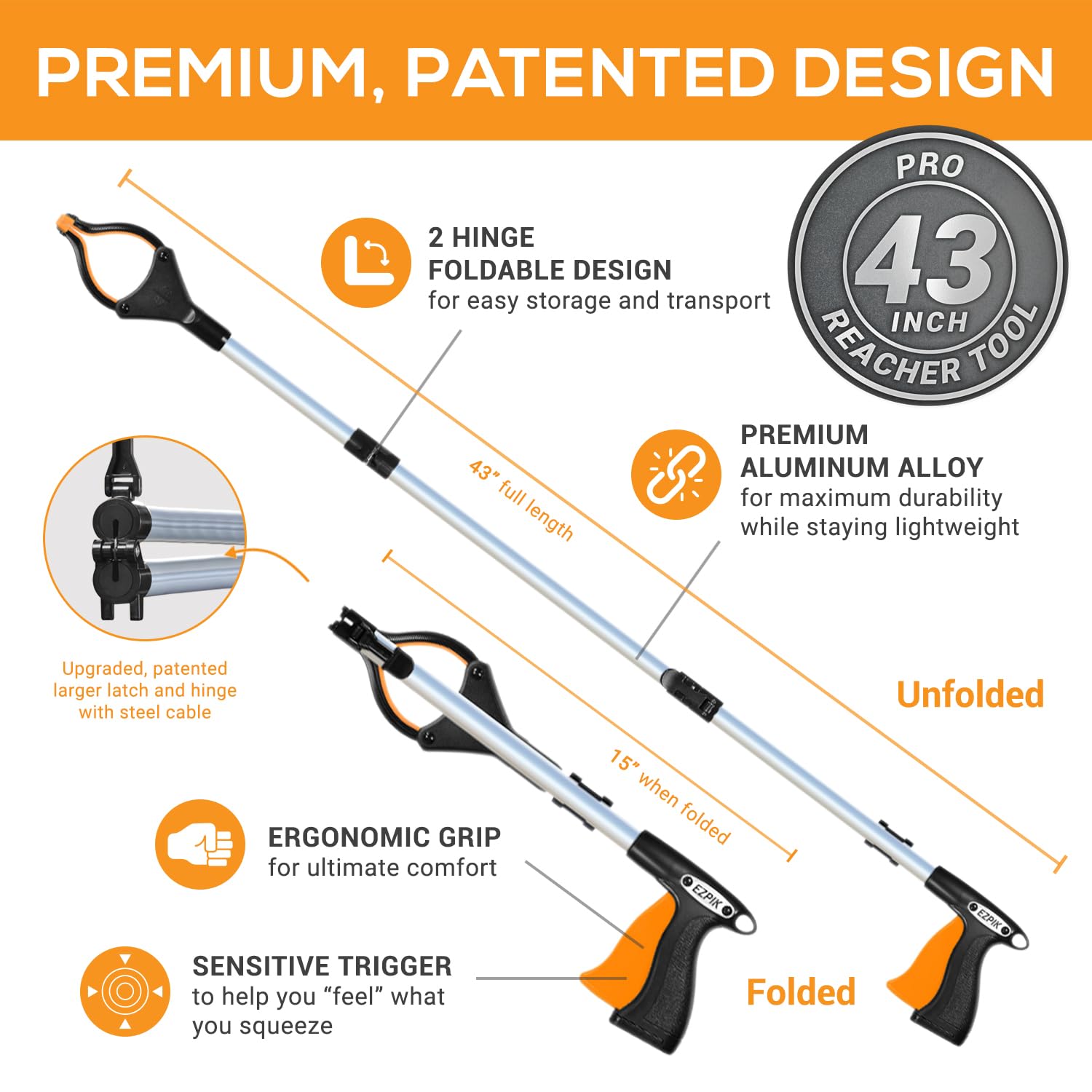 EZPIK Pro 43" Foldable Grabber Reacher Tool for Seniors - Grabbers for Elderly Reaching Tool Heavy Duty Pickup Trash Picker Upper Equipment - Claw Grabber Stick for Reaching Aids, Weed Gripper