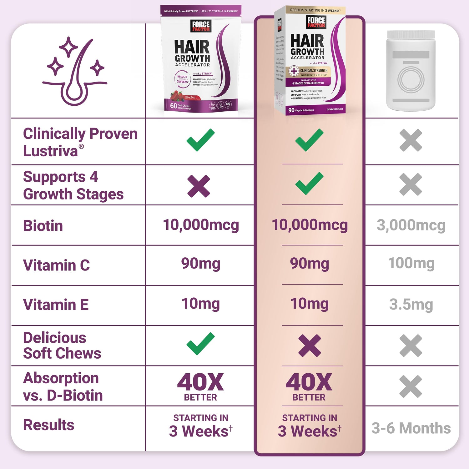 Force Factor Hair Growth Accelerator Soft Chews, Lustriva & Biotin to Promote Thicker, Stronger, Fuller Hair, Hair Growth Vitamins for Women, Clinically Studied + Women's Multivitamin with Iron, 60ct
