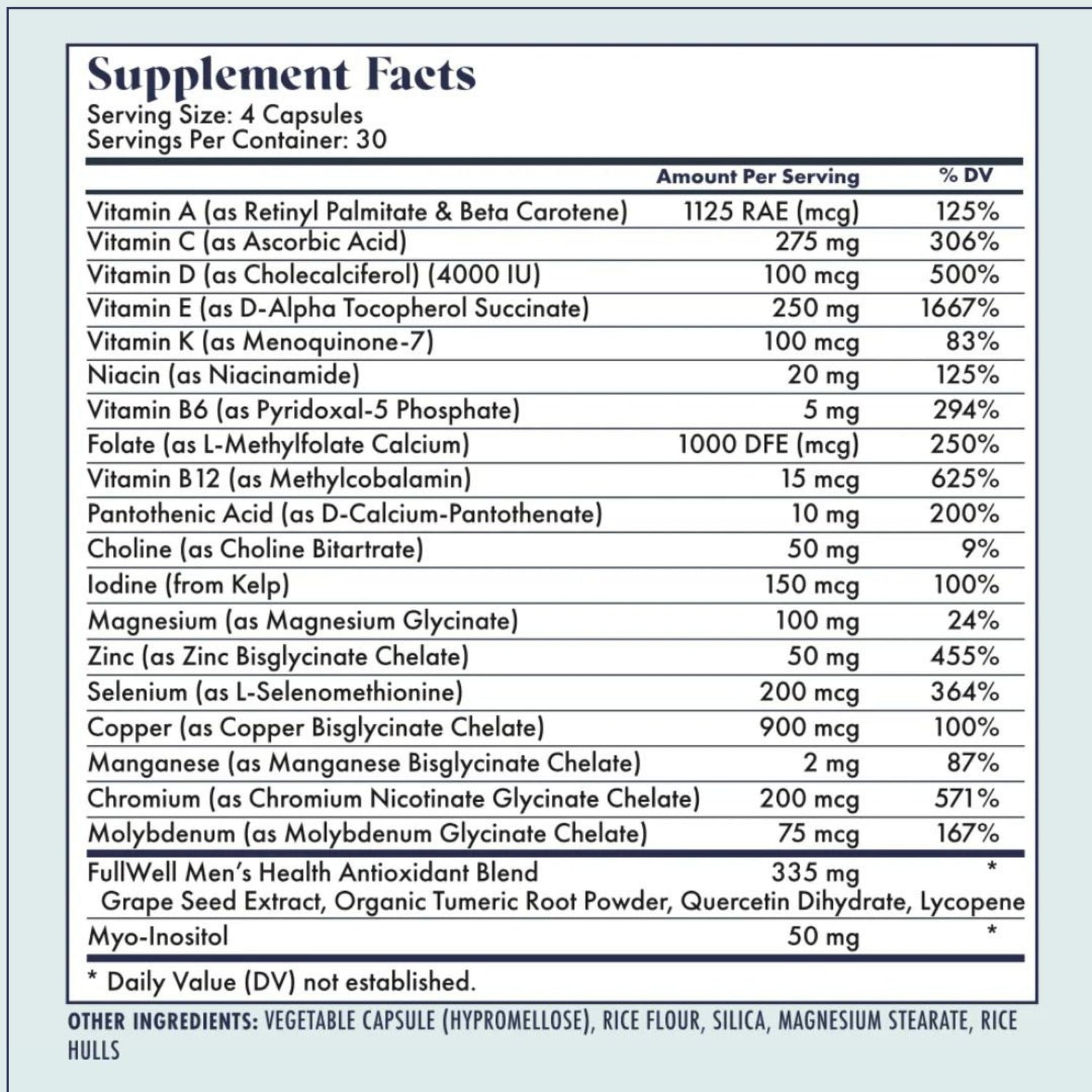 FullWell Men's Daily Multivitamin with Vitamin D, Antioxidants, Choline, and B Vitamins for Optimal Sperm Quality, Hormone Health, and Overall Male Fertility, 3rd Party Tested, 30 Servings