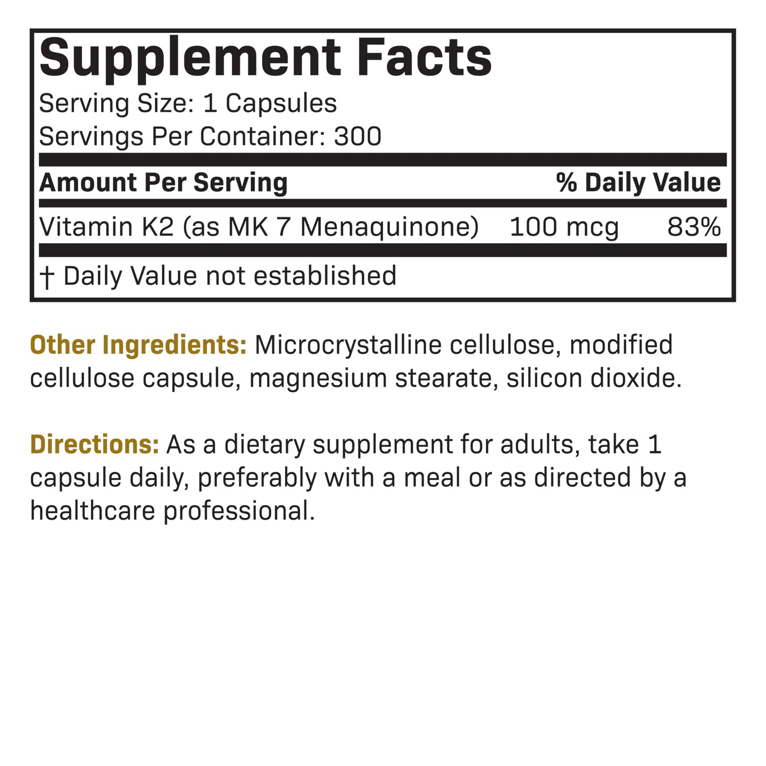 - Vitamin K2 as MK-7: Providing Vitamin K2 as MK-7 to help direct calcium from the bloodstream to the bones. Vitamin K2 as MK-7 has been shown to remain more biologically active in the body compared to other forms of Vitamin K for superior support.