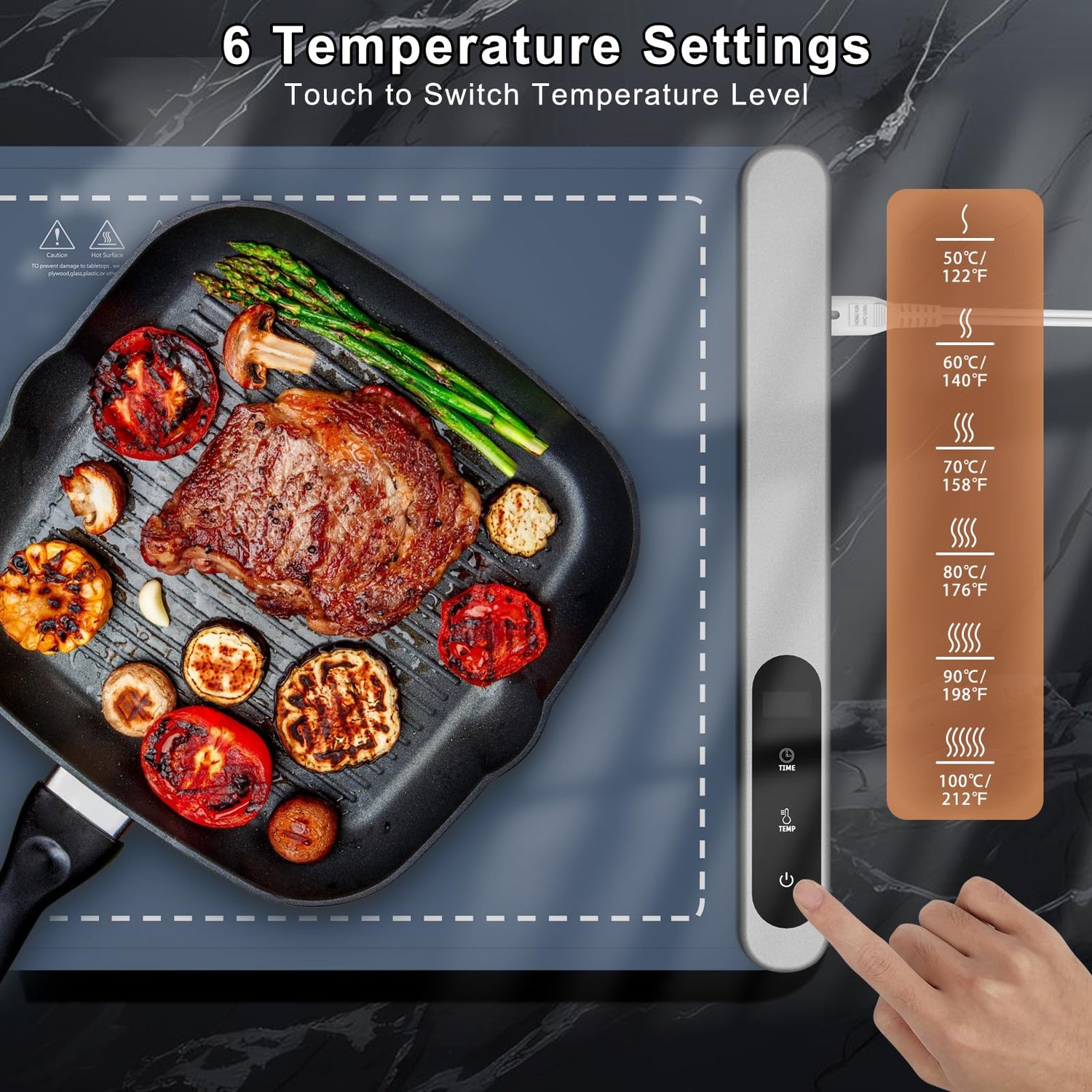 - [PLEASE NOTE]: For using our warming mat on stone or quartz surfaces, it's important to note that these surfaces are heat-sensitive. To avoid damage to your tabletop, either place an insulated mat beneath the product or preheat the surface with a hot towel first. And remember to start with the lowest temperature setting and then gradually increase it as needed.