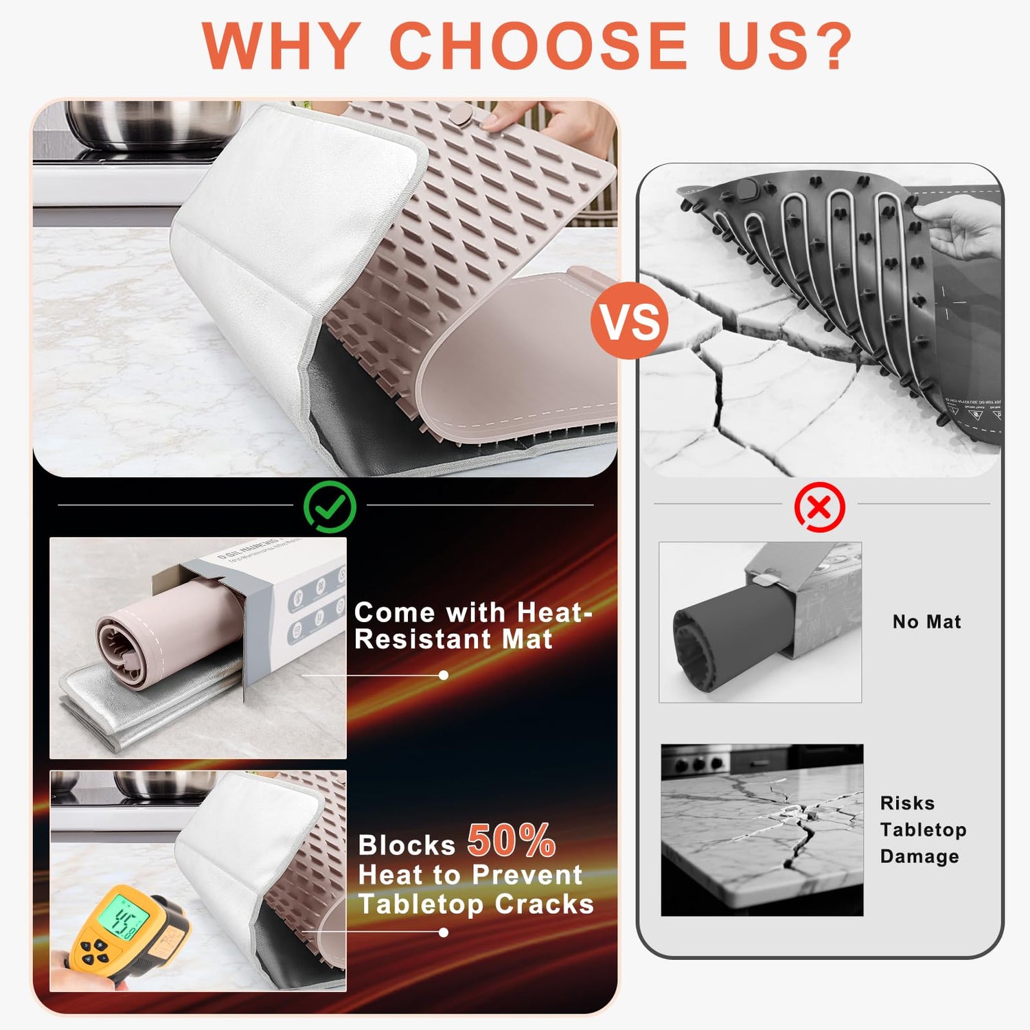 - Why Choose Us? Concerned about tabletop cracking? Our FYY Food Warming Mat included super heat-resistant mat blocks up to 50% of heat, safeguarding heat-sensitive granite, marble or wood surfaces from cracks and damage. (Note: When using this product on heat-sensitive countertops, always place a heat-insulating pad underneath to prevent the countertop from cracking due to excessive heat.)