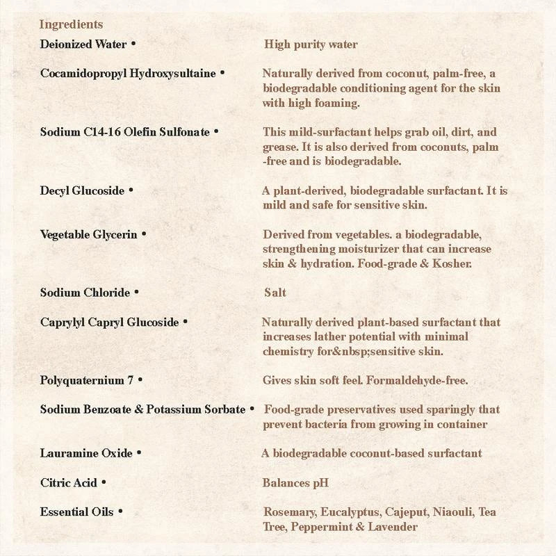 Sodium C14-16 Olefin Sulfonate • This mild-surfactant helps grab oil, dirt, and grease. It is also derived from coconuts, palm-free and is biodegradable.