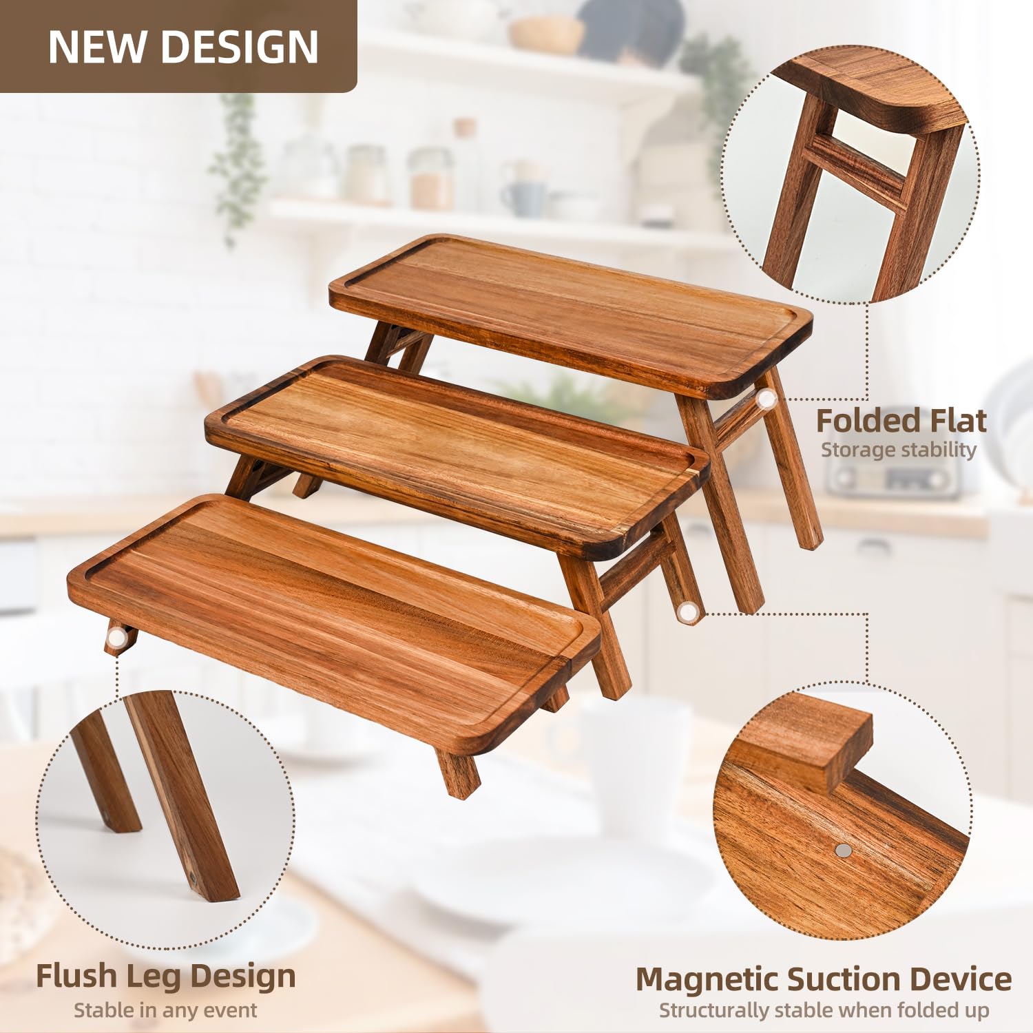 - Foldable Design & Space Efficiency: Set includes 3 tiered foldable wooden trays, the magnetic suction device on the legs helps to fix it when folded. When not in use, it can be easily folded and stacked to save valuable storage space. Make your dining or entertaining experience more extraordinary.