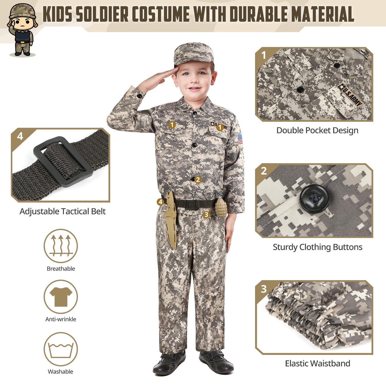 - PERFECT HALLOWEEN GIFT FOR KIDS AGED 3-12 - Kids will be amazed and delighted when they receive this Halloween army soldier dress up role play set! Great choice for Halloween costumes, career day costume, Christmas gift, birthday party gift, stage or army/soldier pretended play, masquerade, outdoor adventuring, or any fancy dress competitions. Show off how patriotic your child is with this Halloween army costumes and you’ll be so proud of your little soldier!