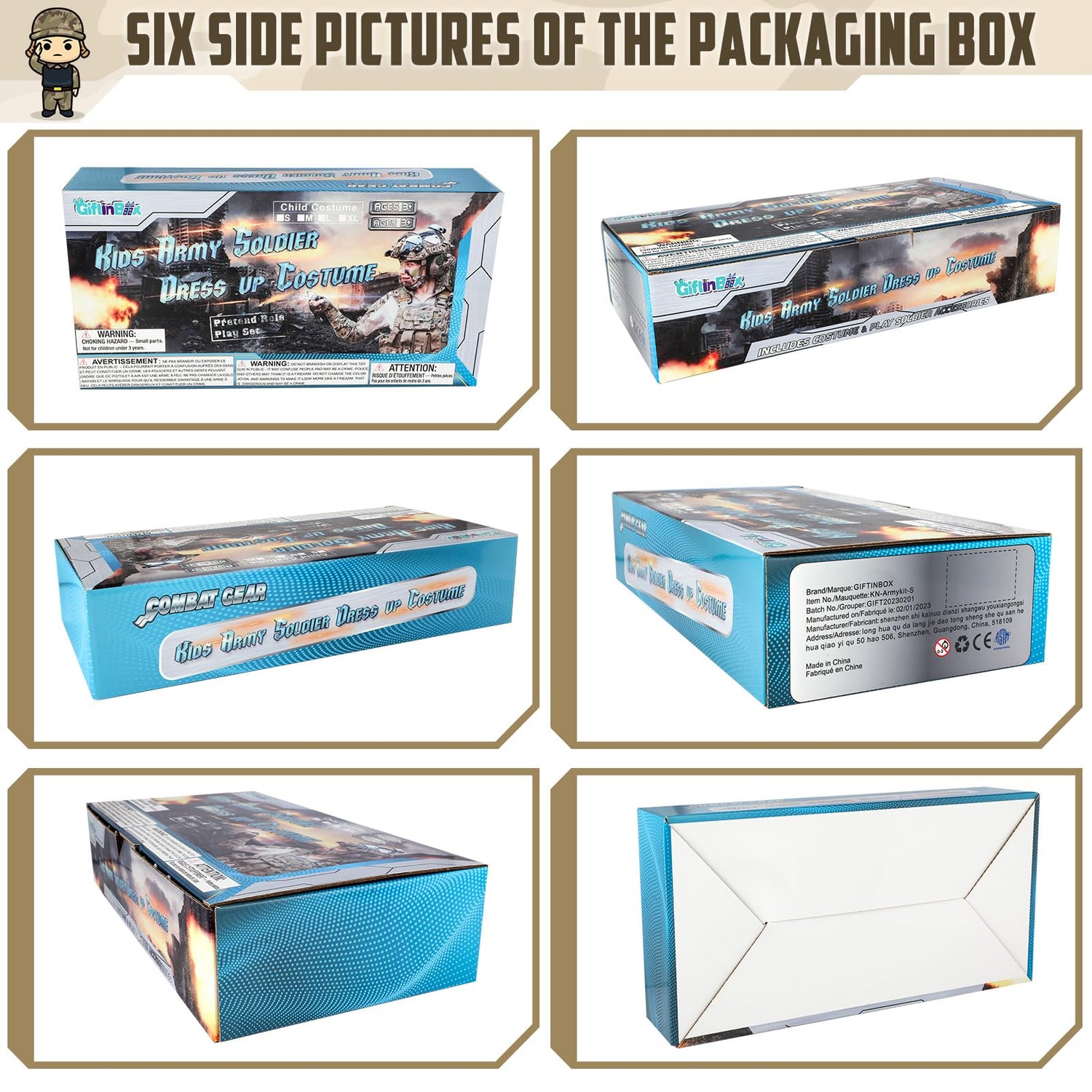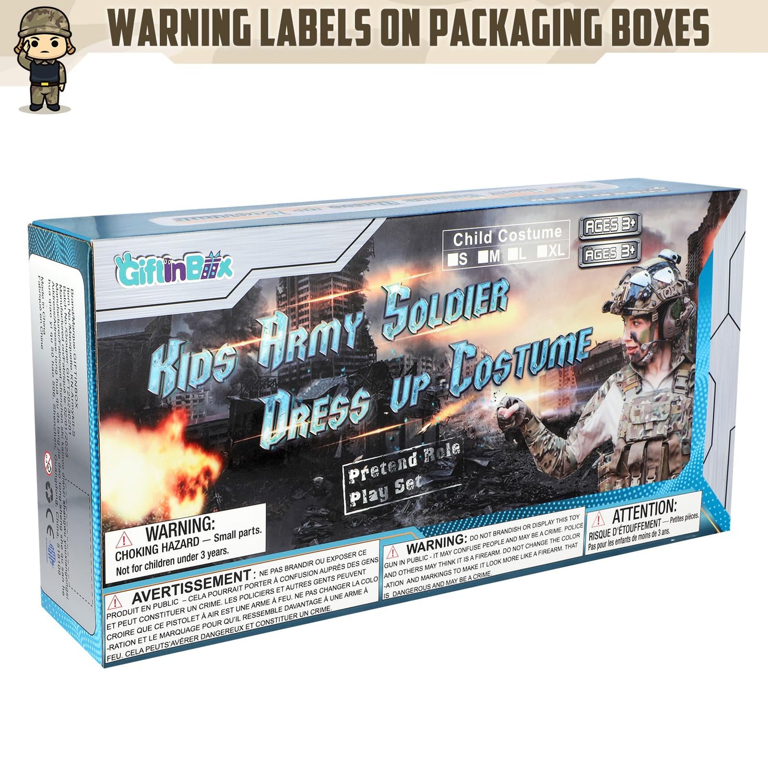 - PREMIUM-QUALITY ARMY SET FOR KIDS - Each item of GIFTINBOX Halloween soldier costume set is made of non-toxic and sturdy materials. All toy accessories are burr-free and won't hurt your kid's little hands. The Halloween soldier costumes are breathable, washable, and reusable. It’s a bargain for you to purchase this kids pretend play dress-up set!