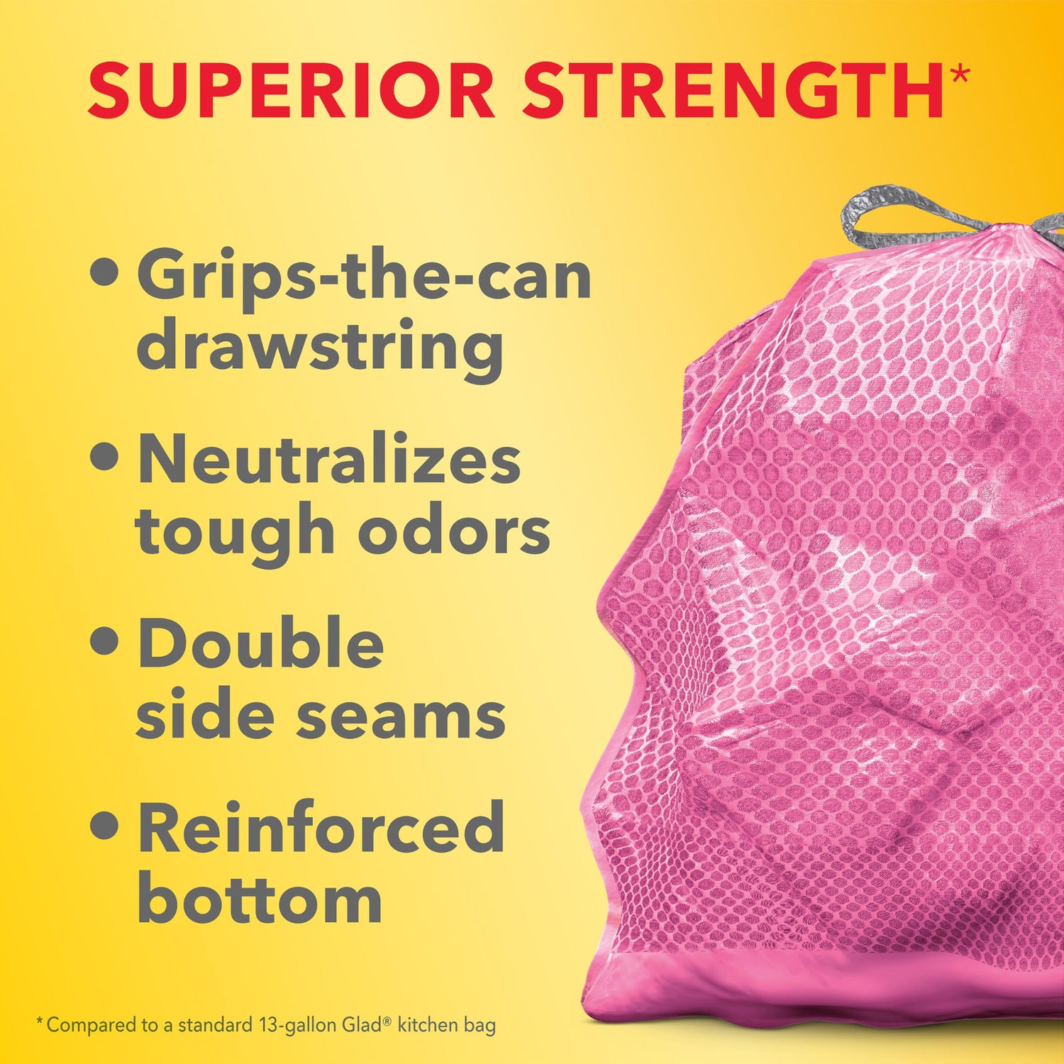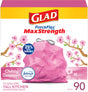 - TALL KITCHEN TRASH BAGS: Ninety (90) 13-gallon Glad ForceFlex MaxStrength Drawstring Tall Kitchen Trash Bags in Cherry Blossom with Febreze Freshness
