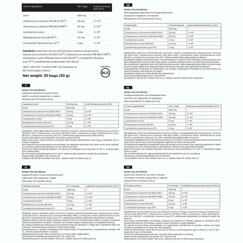 - HIGHEST QUALITY INGREDIENTS, NO ADDITIVES – The natural Golden Tree Oral Biotics is made without stearates, preservatives and artificial sweeteners of any kind. This natural supplement is GMO-free and also free from allergens such as nuts, gluten and dairy. Golden Tree Oral Biotics is also suitable for vegans and vegetarians.
