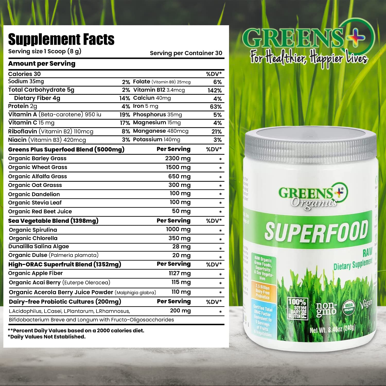 - ๐๐ฎ๐ฉ๐๐ซ๐๐จ๐จ๐ ๐๐ง ๐๐ก๐ ๐๐จ: Daily consumption of fruits and vegetables is problematic, but Greens Plus has your back. Greens Plus superfood is a powerful antioxidant with 2.5 billion dairy-free probiotics you can take on the go. Raw superfood powder contains all the antioxidants, vitamins, and minerals that fruits provide to your body