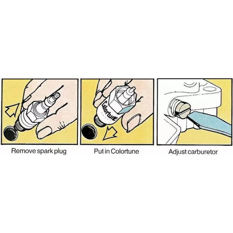 Colortune is an effective and inexpensive fuel system diagnostic tool that enables accurate tuning & fault finding of carburetors with absolutely no guessing. The Colortune test sparkplug has a high temperature quartz glass window that allows the user to actually look into the engine as it is running, and view the combustion flame. Colortune takes advantage of the principle that air/fuel mixtures of different strengths burn different colors, orange is too rich, white is too lean and blue is chemically correct, a 14.7 to 1 ratio. After temporarily installing the Colortune sparkplug and observing the combustion flame, the carburetors can be tuned correctly. Colortune can also be used to diagnose various engine defects by observing inappropriate combustion colors. Colortune can be used on both 4 & 2 stoke engines, from cars and motorcycles to lawn and garden power equipment. Colortune has been available in Europe for many years and has been recommended and used by major automotive manufacturers. The Colortune kit is available to fit all threaded sparkplug hole sizes. Included are very comprehensive instructions providing detailed fuel system and engine fault finding information.