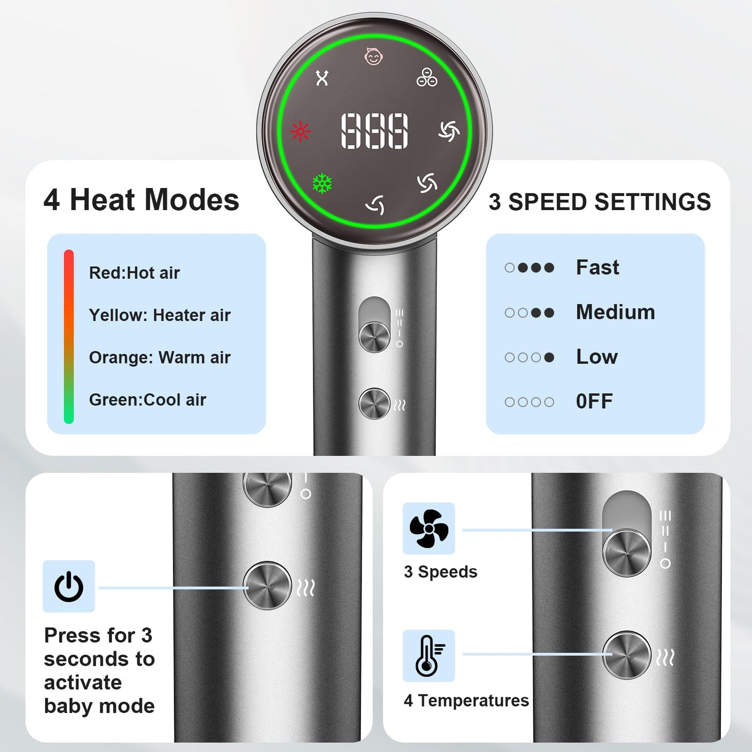 - 【5 Temps & 3 Wind Speeds】The GUOWO high-speed hair dryer offers 5 temperature options (Cool/Warm/Heat/Hot and Baby Mode - activate circulating mode by pressing and holding the temperature settings button for 3 seconds) and 3 speed settings (Low/Medium/High). These adjustable settings allow you to customize heat and airflow for various drying and styling needs. This compact hair dryer is designed to adapt to any desired look.