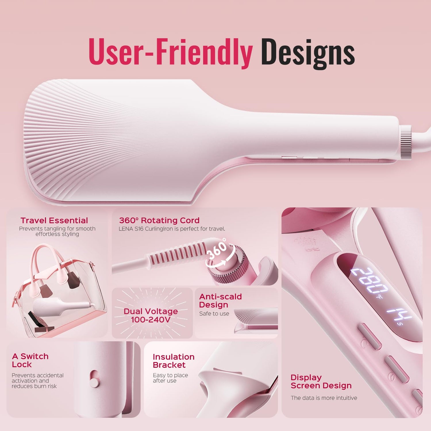 Hair Waver LENA S16 Beach Waves Curling Iron, Hair Tool for Women with 3 Titanium Ceramic Barrels, Anti-Scald Protection, Smart Timer & Adjustable Temps, Dual Voltage, 1.25 Inch, Pink