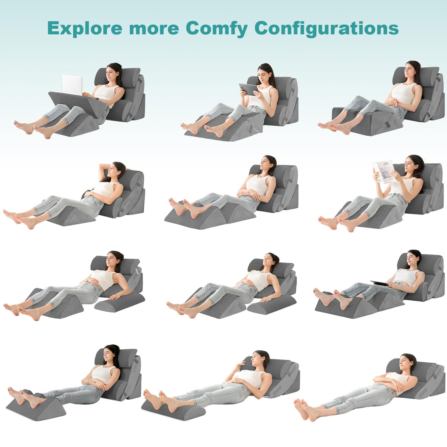 - MULTIFUNCTIONAL USE: Hansleep wedge pillow set consists of 7 parts, which you can combine to find a comfortable and supportive position when you are reading, watching TV, playing on the phone, being pregnant or sleeping. The adjustable extension of the magic tape on the back pillow ensures that the position can be adjusted for perfect comfort, while the leg pillow doubles as a convenient table.