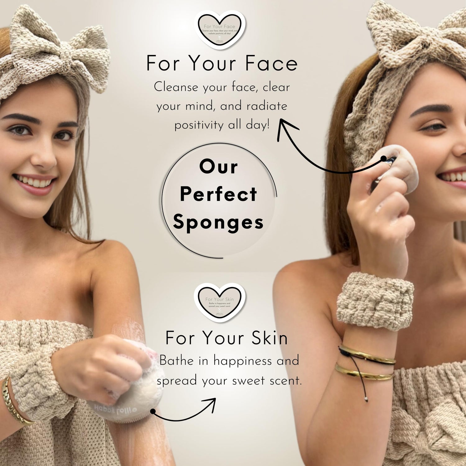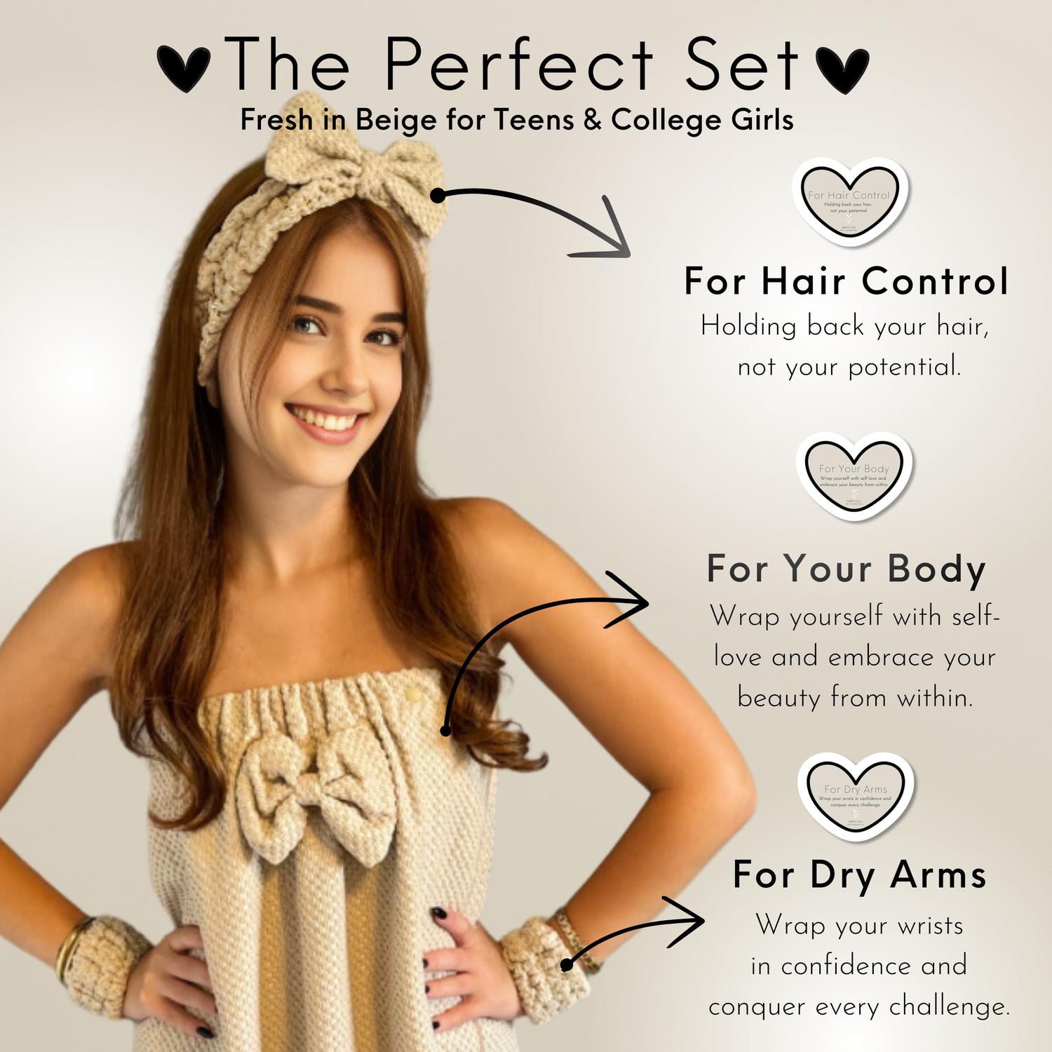 Happy Lolli Power Shower Gift Set: Luxury Bath Accessories Basket for Women & Teen Girls – Includes Body & Hair Towel, Wrist Bands, Headband, Face Sponge & More – Empower Your Routine (Fresh in Beige)
