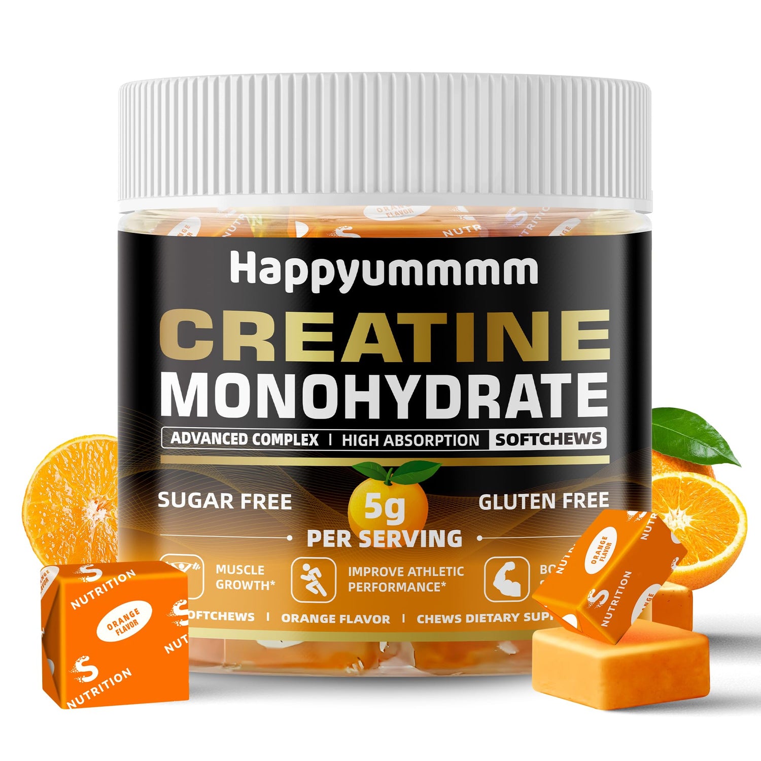 Happyummmm Creatine Monohydrate Soft Chews 5g for Men & Women, Preworkout Gummy with Electrolyte for Muscle Growth, Strength & Energy Support, Orange 60 pcs