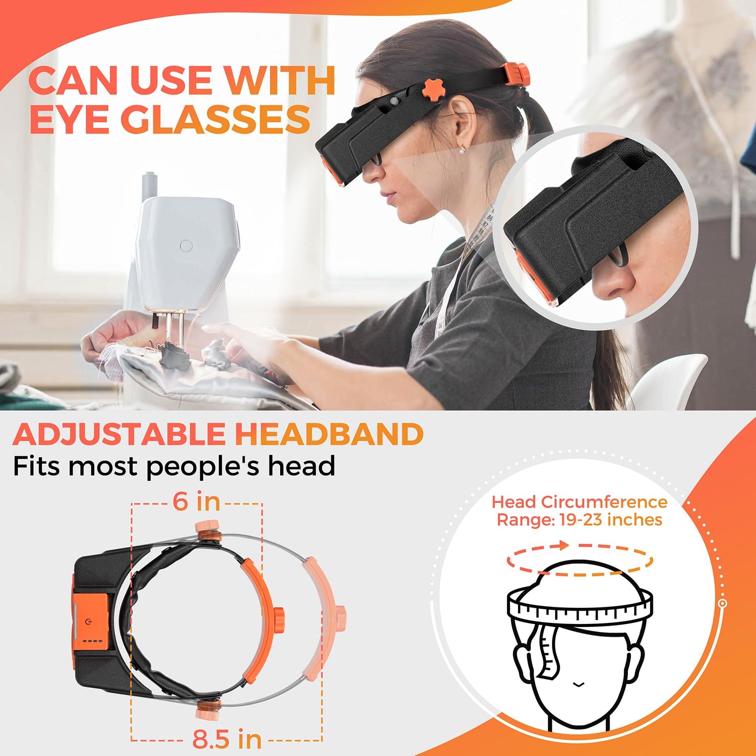 Headband Magnifier with Light, Rechargeable Magnifying Glasses for Close Work, 1.5X - 3.5X Magnify Headset with 4 Lenses, Jewelers Magnifying Glass Loupe Visor for Reading,Crafts, Hobby