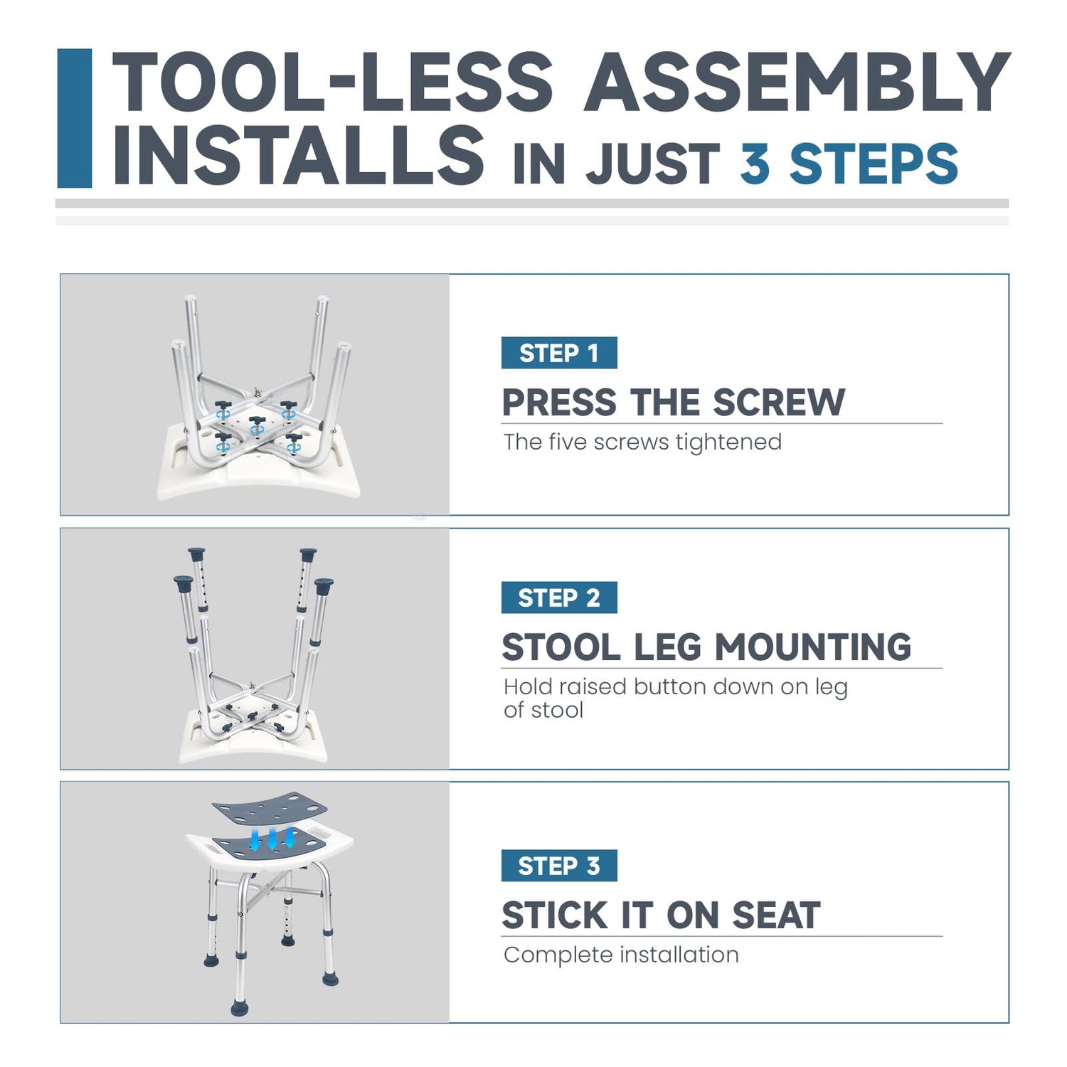 - Tool-Free Assembly: Our bathroom chair comes with a detailed instruction manual and features a simple design that requires no tools for assembly. You can complete the installation in just three steps and ten minutes, making the entire process effortless.