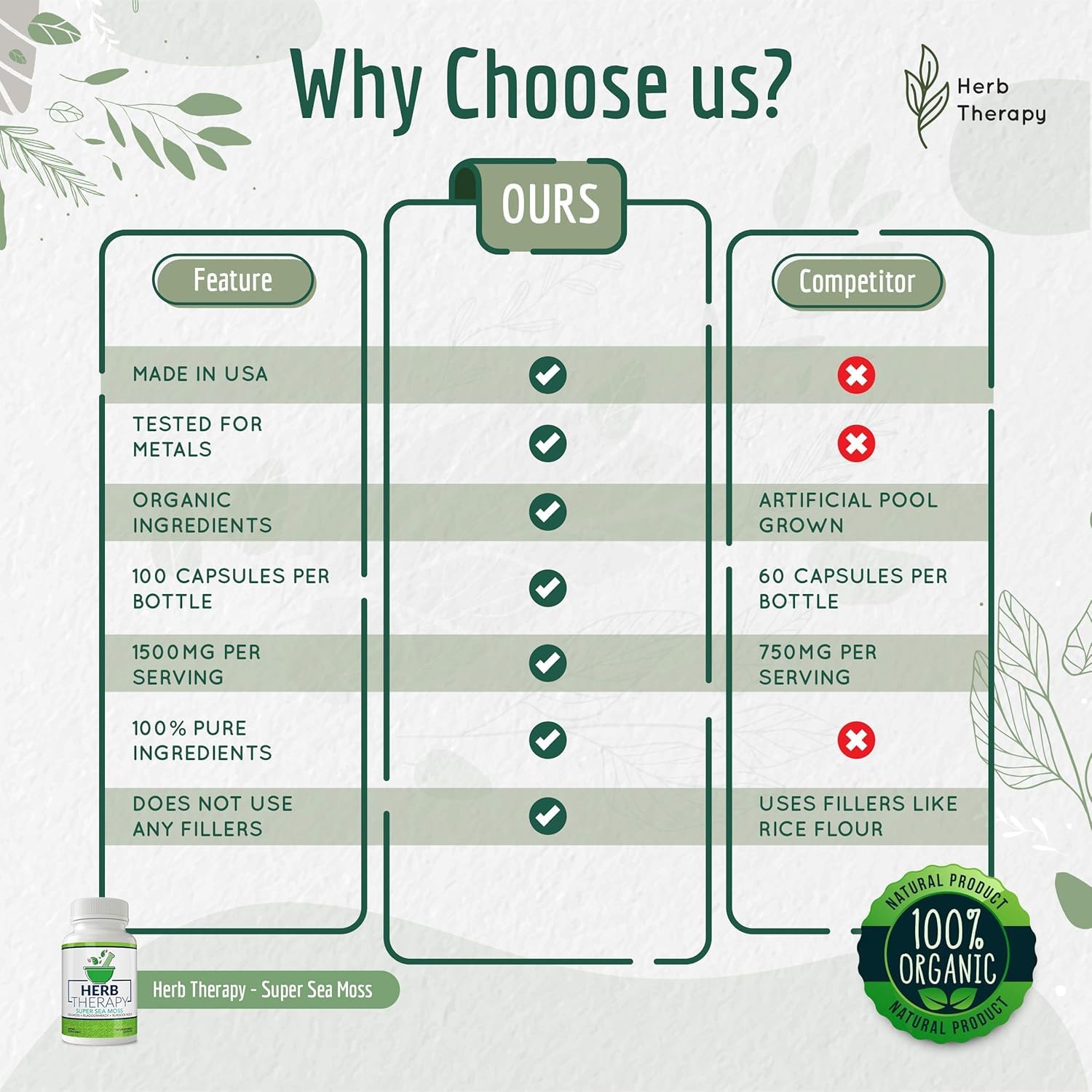 - HIGH POTENCY SUPER SEA MOSS: Herb Therapy's organic Irish sea moss capsules pack a powerful punch with 1,500mg of our proprietary blend, double the amount found in most sea moss pills. Experience the benefits of our wildcrafted formula, free from harmful fillers, and enriched with 102 beneficial nutrients.