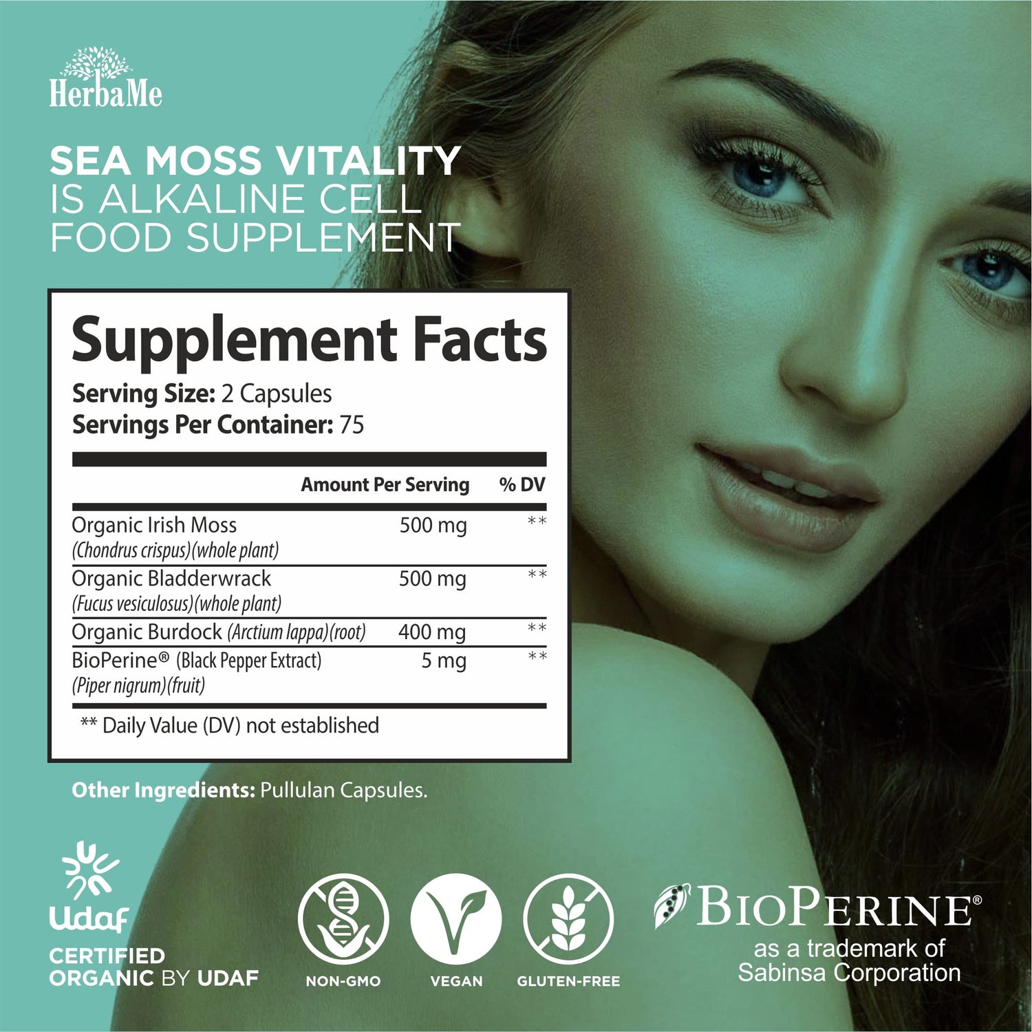 HerbaMe Organic Irish Sea Moss with Bladderwrack, Burdock Root & Black Pepper Extract, 150 Capsules, Thyroid Support, Natural Iodine Source, Promotes Immune System, Cell Food, Alkaline Supplement