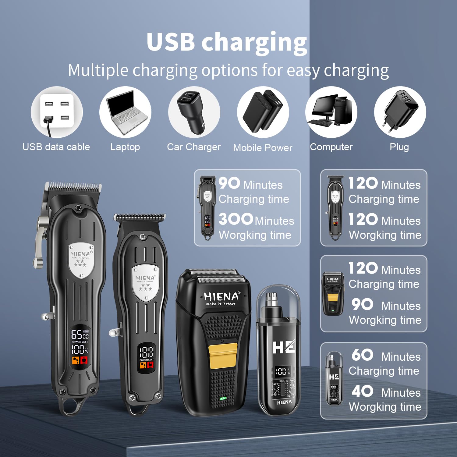 - 【1500mAh Large Battery & USB】This hair clipper set is equipped with a large capacity battery. and the large clipper can be fully charged in just 90 minutes. It runs for up to 5 hours. In addition, the trimmer can be fully charged in just 120 minutes and can continue to work for up to 2 hours; The shaver can be fully charged in 2 hours and run for up to 90 minutes, The nasal hair device can be fully charged in just 1 hour and run for up to 40 minutes. It is easy to carry and very suitable for travel. You can use your computer, car charger, and even our USB charging cable to charge them anywhere.