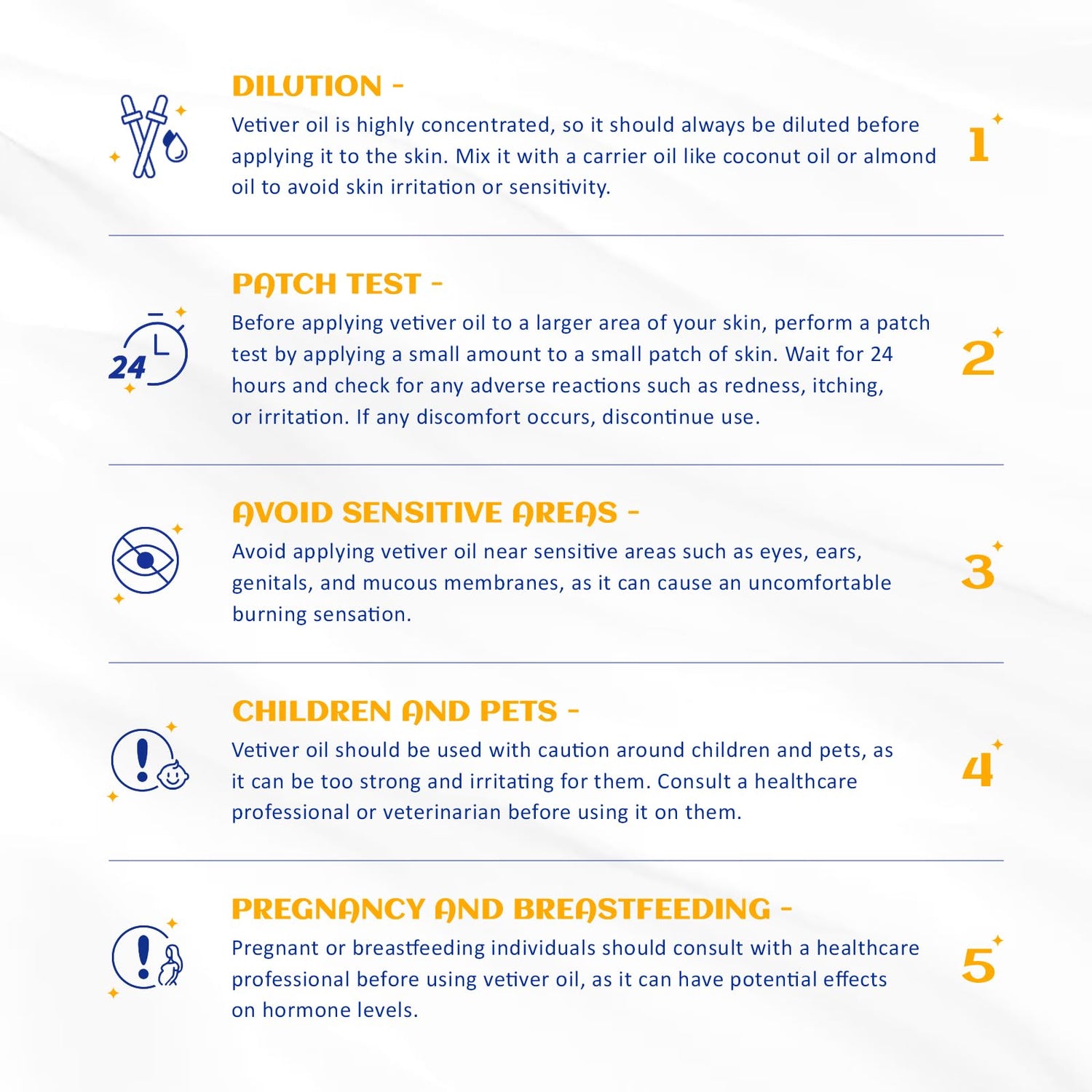 - Multiple Blend: The woodsy scent of vetiver essential blends well with Clary Sage, Lavender, Rose, Sandalwood, and Ylang Ylang. Dilute with carrier oil before use. Test on feet first for skin sensitivity prior to widespread use