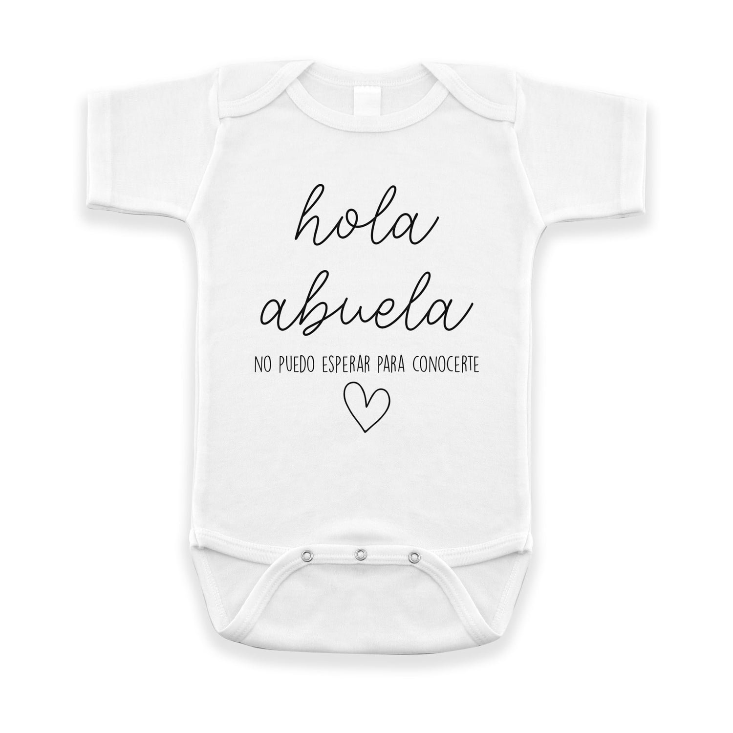 Details: Short sleeve white or natural infant bodysuit. Perfect for pregnancy announcement and new baby reveal! Surprise those new grandparents with this fun little gift. Our Hola Abuela infant bodysuit is sure to delight that special grandma in your life.