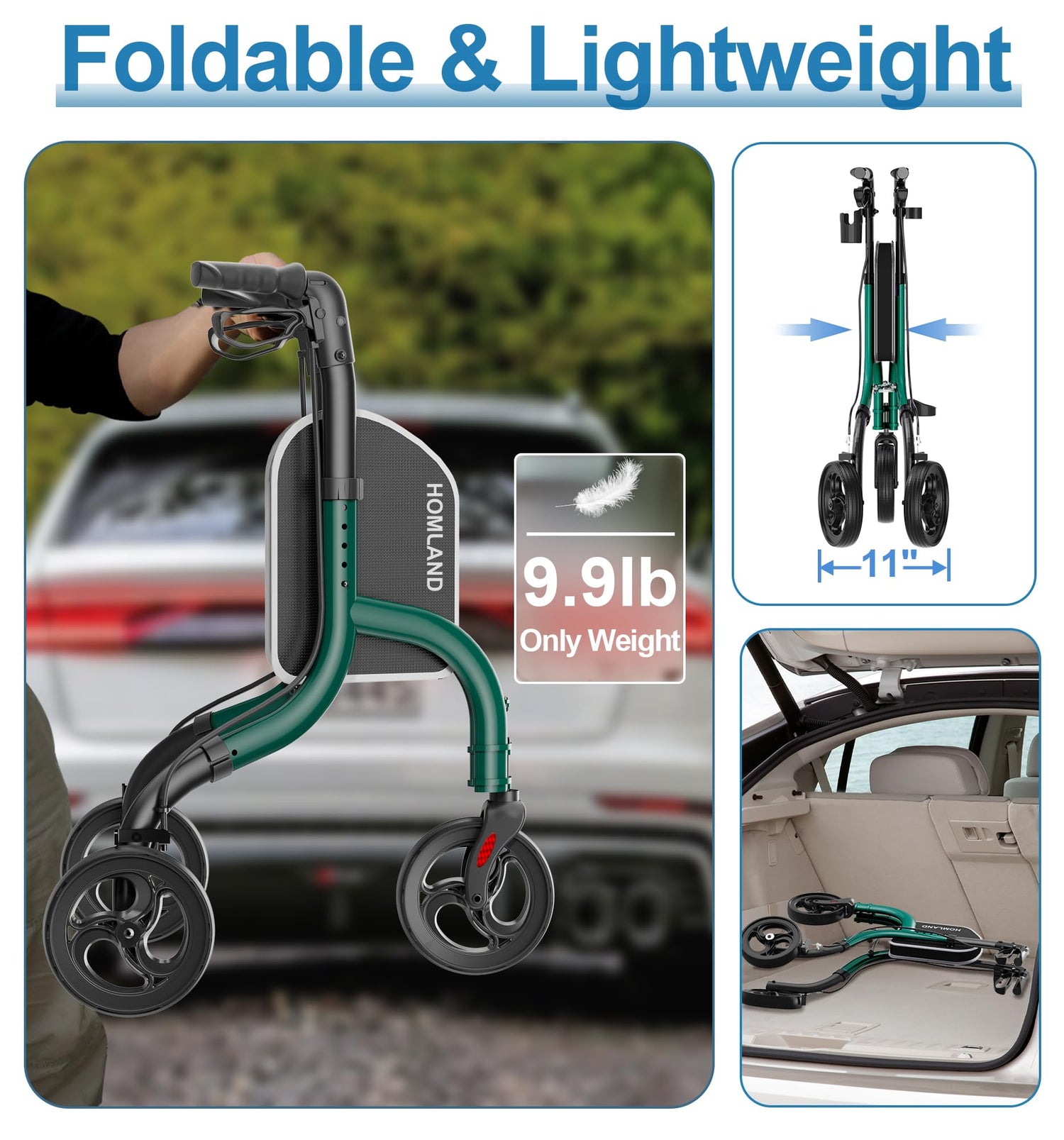 HOMLAND 3 Wheel Walkers for Seniors, FSA/HSA Eligible Foldable Wheeled Rollator with Cane Hold and Cup Hold, Lightweight Three Wheel Rolling Walker Height Adjustable for Seniors