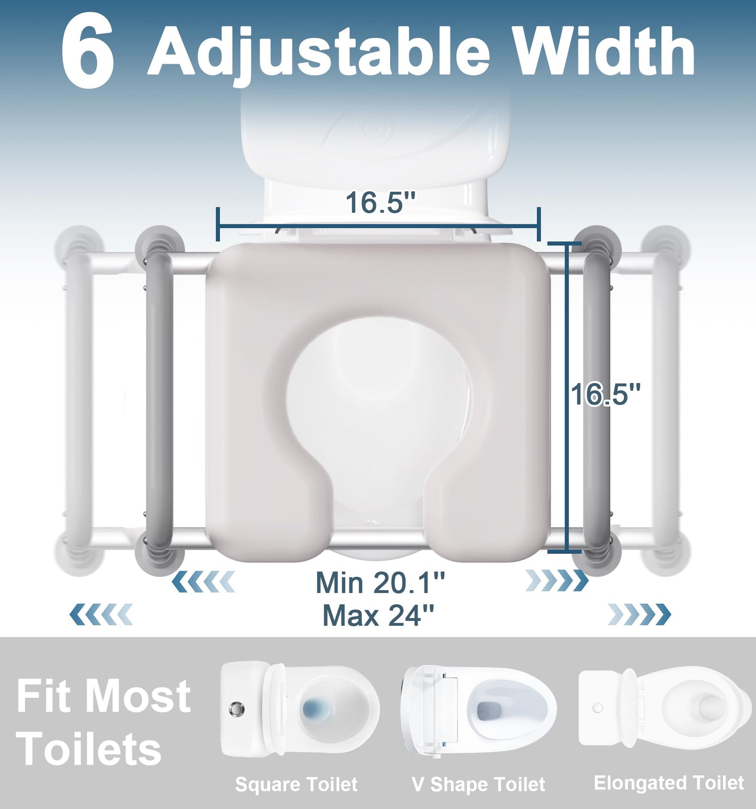 - Adjustable Width & Height - Our raised toilet seat with handles features adjustable height and width, offering excellent adaptability. It can be adjusted from 18.1" to 24" in seat height, 27'' to 33'' in handle height, 20.1'' to 24'' in product internal width, making it suitable for people of various heights and toilets of different sizes. Perfect for the elderly, seniors, handicapped, disabled, pregnant and adult who need different height for toileting, etc