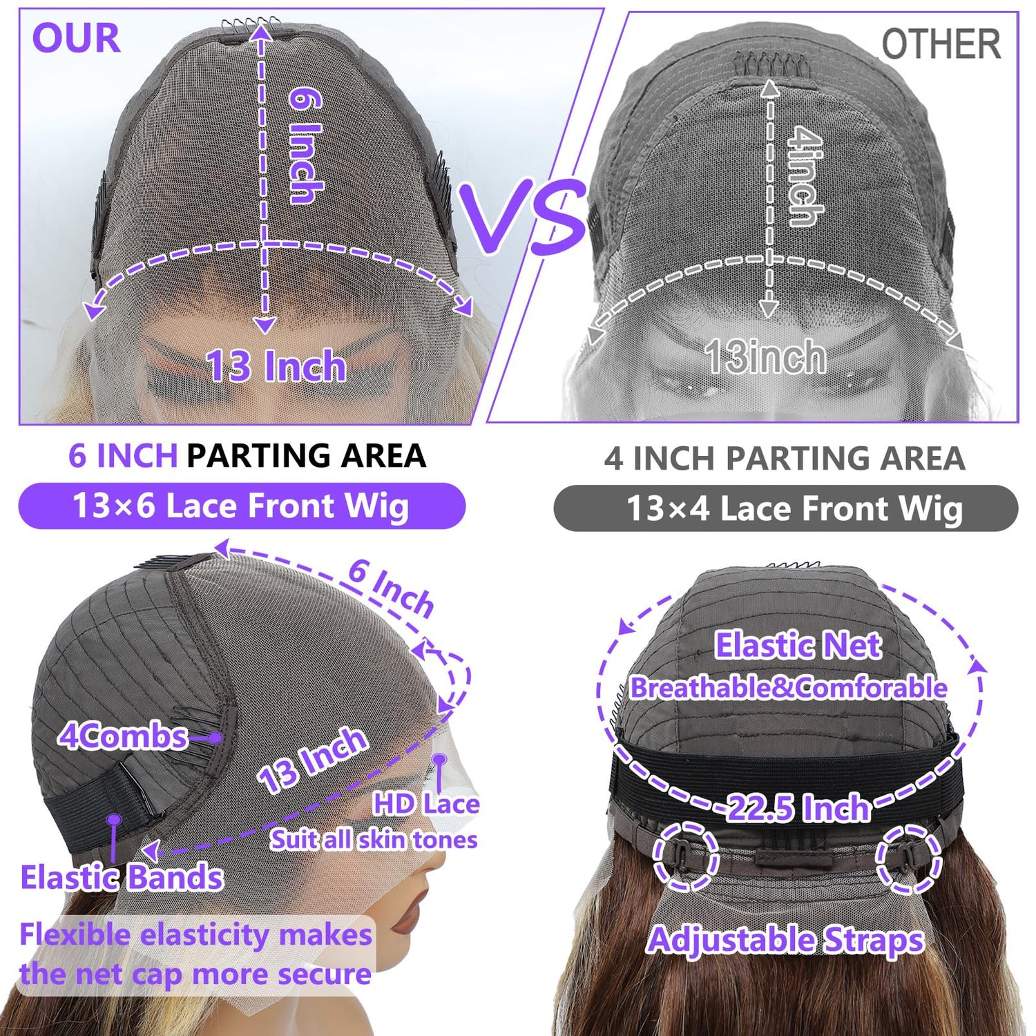 - Ombre Human Hair Wigs Cap: Designed for comfort and easily install, 5D dome cap fits most head sizes (21.5 - 22.5 inches). Lightweight and beginner friendly. 4 combs, 2 adjustable straps, and a removable elastic band for a secure fit. 2-inch lace on the back makes honey blonde body wave wig ideal for ponytail.